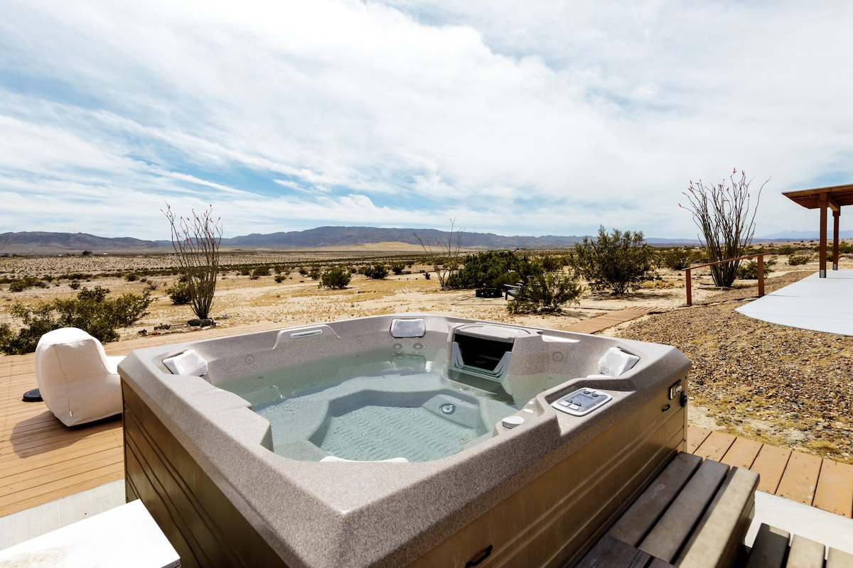 Isawsaw ang iyong sarili sa bagong itinayong marangyang 3 silid - tulugan, 2 Bath home na nagtatampok ng mga malalawak na bintana na nagpapakita ng mga nakamamanghang tanawin, nakakasilaw na heated pool at spa para sa mga starlit dips, at nakatalagang fitness space. I - unwind sa ilalim ng walang katapusang kalangitan sa 2 malawak na ektarya sa iyong sariling pribadong oasis, na perpekto para sa mga pagtitipon ng stargazing at patyo. Gumising sa mga nakamamanghang pagsikat ng araw, tuklasin ang iba pang mga kababalaghan ng Joshua Tree, pagkatapos ay bumalik para sa isang nakakapagpasiglang pagbabad sa iyong disyerto.