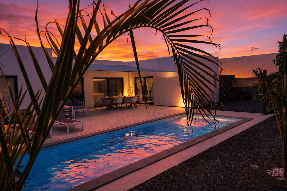 Discover Villa Lima, a contemporary retreat in Lajares with a heated private pool, surrounded by volcanoes and offering unique views of the sacred Tindaya Mountain. Privacy, modern design, designer furnishings, and a serene environment make every sunset a spectacle. As part of Aura Collection, you can book exclusive experiences such as a private chef, massages, or yoga. Where design and tranquility meet.