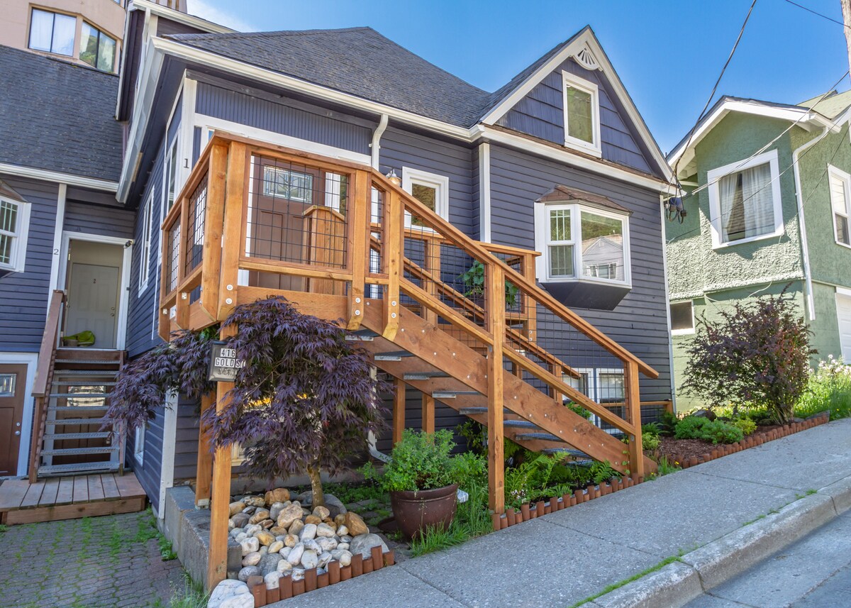 Maganda ang studio apartment sa ibaba na may sariling pribadong pasukan. Buong kusina at sala. Isang king - sized na higaan at isang pullout na full - sized na higaan. Pribadong banyong may shower. Sapat na paradahan sa kalye. Perpekto para sa iyong pakikipagsapalaran sa Juneau! Matatagpuan sa kanlurang gilid ng downtown Juneau, dalawang kalye sa itaas ng aurora boat harbor. Mga tanawin ng mga bundok ng Gastineau Chanel at Juneau sa harap ng pinto. Mga Detalye ng Pagpaparehistro CBJ1000075