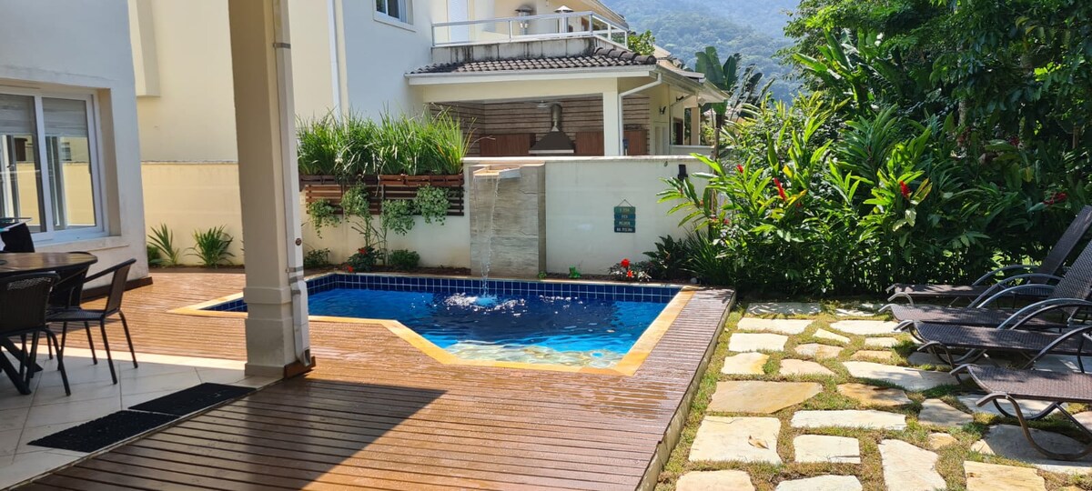 Linda casa, novíssima, fina decoração. Paisagismo exuberante integrado à mata atlântica. Três vagas de garagem (veículos médios). Aproximadamente 500mts da praia. Ar condicionado em todos as suítes e sala, churrasqueira individual, cozinha completa, 3 Tv's smart, tv via satélite com pacote completo, wi-fi fibra ótica Ambiente muito tranquilo e sossegado. Condomínio fechado com portaria 24hs, serviço de praia (6 cadeiras e 3 guarda-sóis) montados pela equipe do condomínio TODOS os dias do ano.