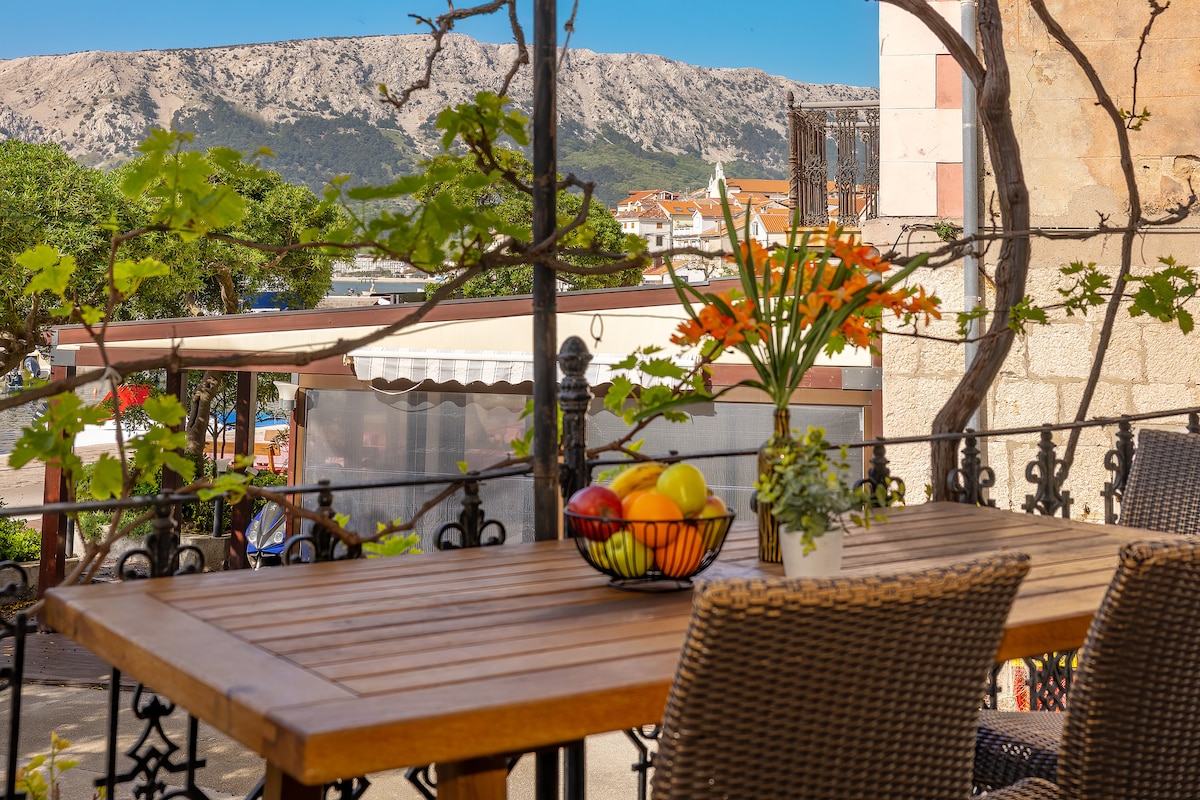 Ang maaliwalas na munting bahay na ito ay matatagpuan nang direkta sa gitna ng lumang bayan ng Baška. Dalawang magkahiwalay na silid - tulugan, isa sa unang palapag, isa sa attic, kusina na may sala at magandang balkonahe sa ikalawang palapag at isang maliit na banyo ang binubuo ng 47 hakbang na apartment na ito. Parehong may air conditioner ang attic at ang 1st floor. Tamang - tama para sa isang holiday ng pamilya: ang beach sa harap lamang ng bahay, hindi na kailangan ng anumang transportasyon, pribadong paradahan sa 300 m mula sa accommodation..
