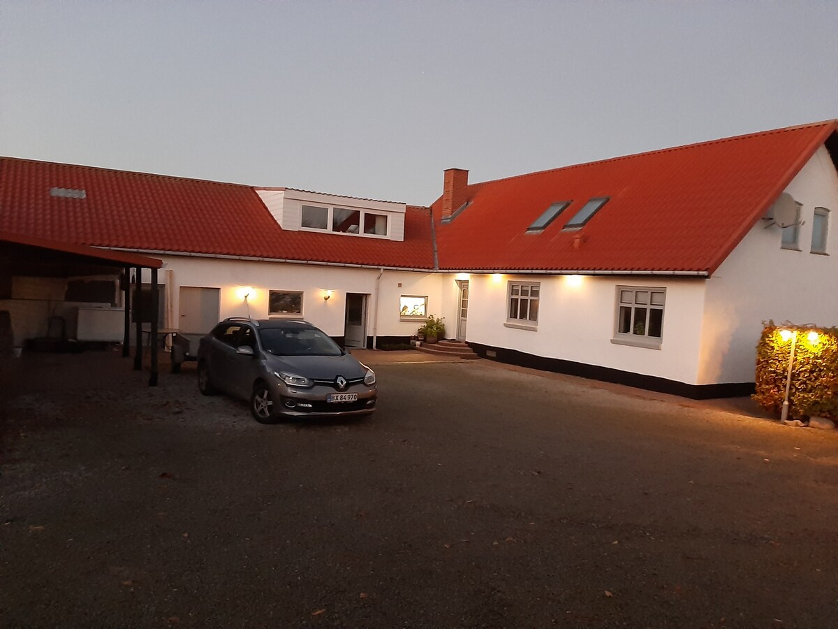 Stor lys lejlighed med egen P-plads, terrasse, gratis kabel-tv og wi-fi. Vi bor tæt på skov og strand med gode fiske muligheder, flotte vandreruter og god badestrand. Der er cykler og grill til rådighed på terrassen.