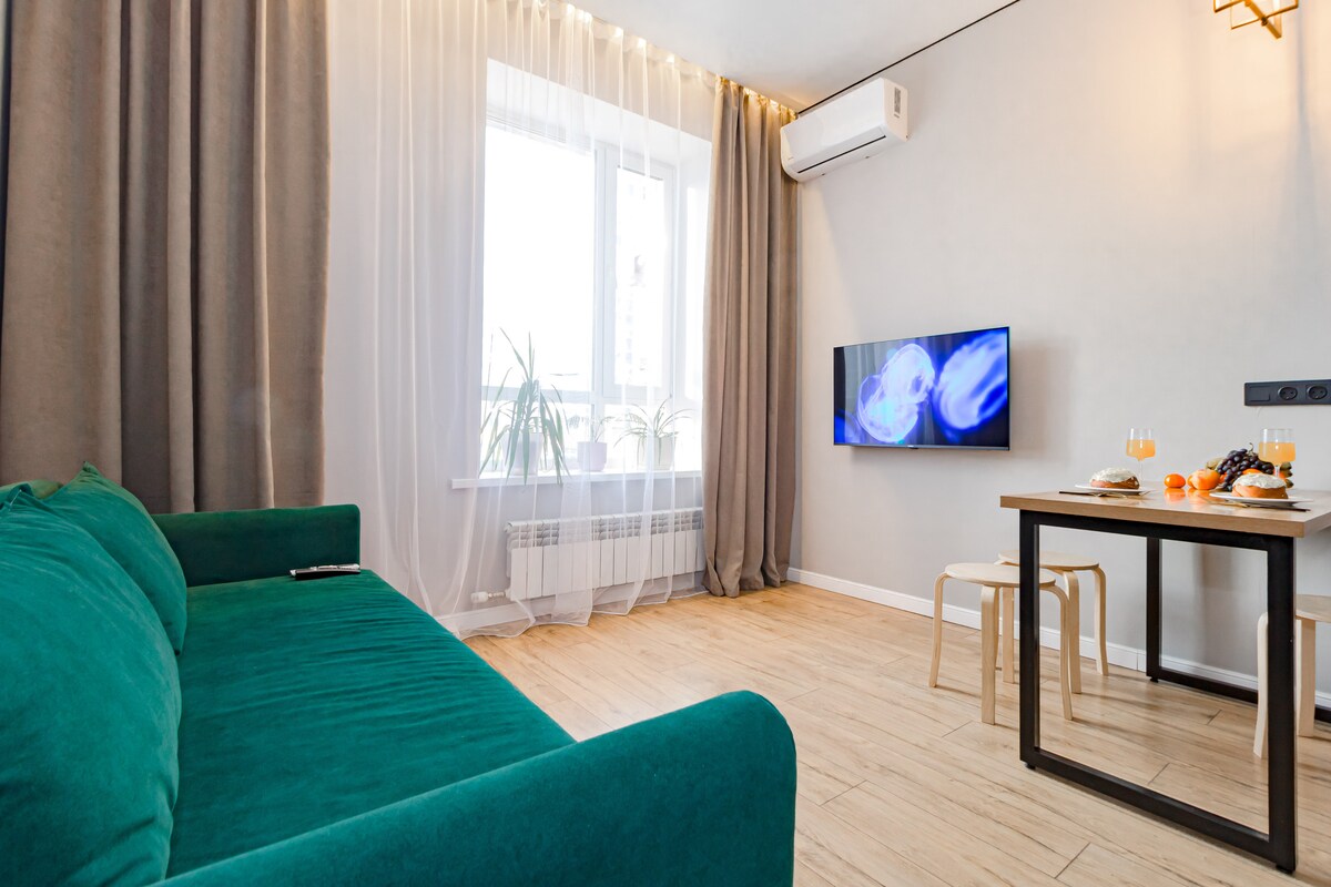 Kumbinasyon ng kaginhawaan at kaginhawaan ang high - end na apartment na ito! Matatagpuan ito sa isang business class na bahay, 1 minutong lakad lang ang layo nito mula sa EXPO. Ang perpektong lokasyon ay ginagawang isang mahusay na pagpipilian para sa mga bakasyon sa negosyo at pamilya. Napapalibutan ang bahay ng maraming tindahan, cafe, restawran. Ang malaking patyo ay lumilikha ng komportableng kapaligiran para sa mga laro at paglalakad. Ginagarantiyahan namin ang perpektong kalinisan at espesyal na kapaligiran ng kaginhawaan. Huwag palampasin ang pagkakataong mamalagi sa nangungunang apartment sa lungsod at mag - enjoy sa iyong pamamalagi.