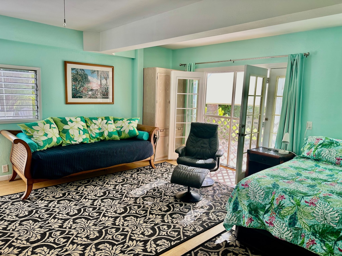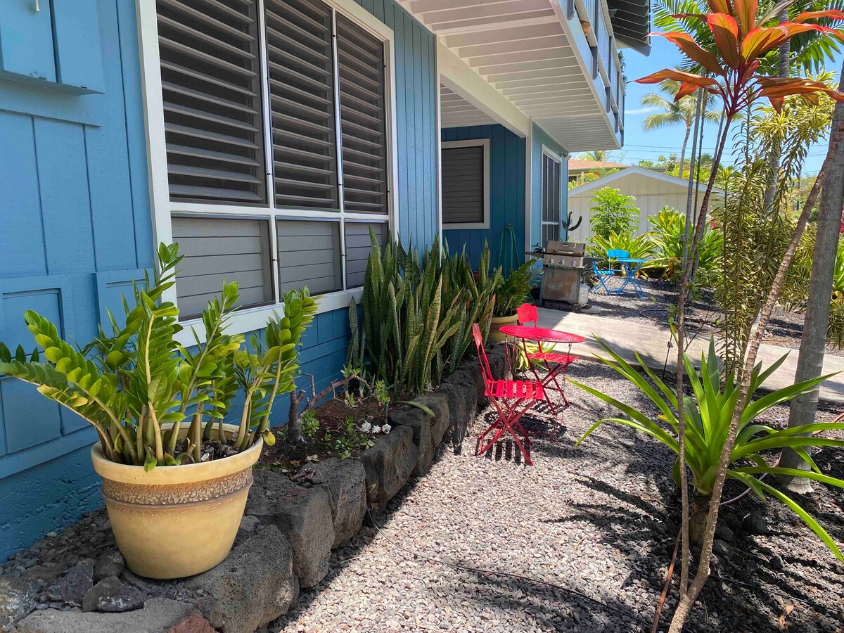 Malaking studio na may kumpletong kagamitan na may takip na lanai at pribadong shower sa labas. Walking distance sa Magic (White) Sands at Kahaluú Beaches. Dumadaloy ang hangin sa karagatan buong araw. Pribadong pasukan. Nakabakod. Nakatalagang paradahan. Tahimik at ligtas na kapitbahayan na may madaling access sa kasiyahan sa karagatan, pamimili, libangan. Mga magagandang tanawin ng paglubog ng araw. Matatagpuan ang maikling biyahe papunta sa isa sa mga pinakamagagandang pasilidad sa isla para sa Pickleball at tennis: 20 korte na may 8 lighted court, punch card, open play at mga aralin.