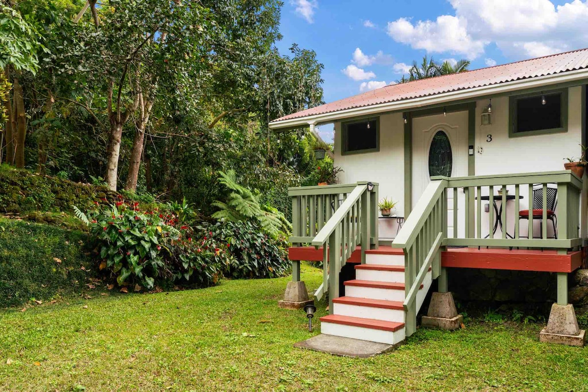 Mountain retreat "Munting bahay" na cottage na may loft, na nakakabit sa pangunahing bahay ngunit ganap na pribado. Kumpleto na may Air Conditioning! Isa itong tahimik na bakasyunan mula sa mabilis na takbo at maingay na bayan, na napapaligiran ng kalikasan - 15 minuto mula sa sentro ng Kona. Dapat ay kaya mong umakyat ng hagdan paakyat sa loft bed. Mayroon kaming mga sariwang itlog mula sa aming mga hens at pana - panahong Avos, Lemons, Papaya, Lychee, Mamaki Tea, Pineapple, atbp. Mainam para sa solong biyahero o magkapareha na tatawaging "home - base" habang tinutuklas ang Big Island.