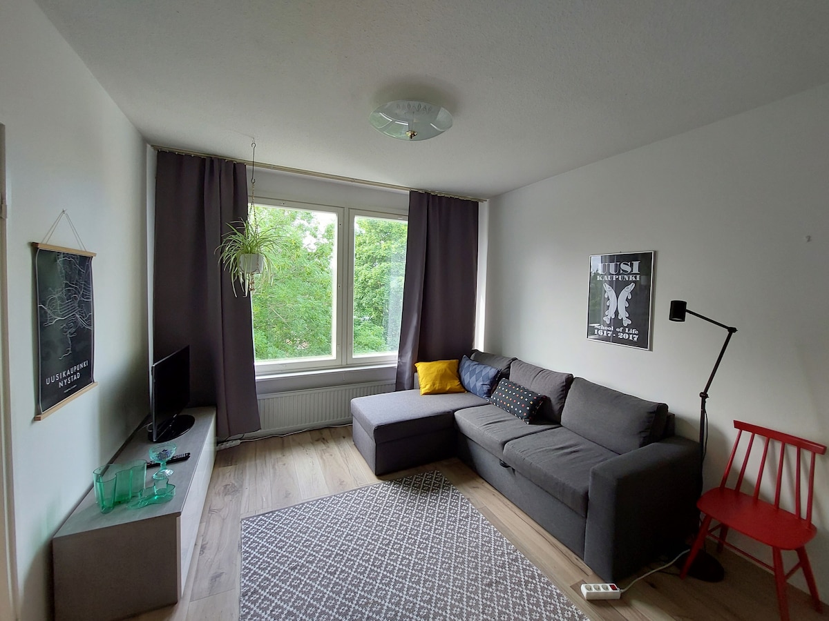 Malawak na bahay na tatsulok na kumpleto sa kailangan para sa maiikli o mahabang pamamalagi. Mainam ang lokasyon: ang pinakamalapit maglakad - lakad ang grocery store layo. Ang sentro ng Uusikaupunki na may mga serbisyo na 2 kilometro lang ang layo. Matatagpuan ang apartment sa ikalawang sahig sa isang elevator house. Madaling mag - check in gamit ang key box. May kasamang bed linen at mga tuwalya. Wifi Pribadong paradahan na may heating pole. Wala pang 4 km ang layo ng Valmet Automotive. Work boat 3 km