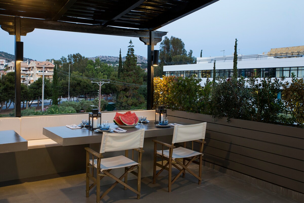 Minimal suite, bagong na - renovate na 10 minuto mula sa paliparan. Malaya na may pribadong banyo, terrace, hardin at mga kamangha - manghang tanawin. Ang eleganteng disenyo at modernong estilo nito ay magbibigay sa iyo ng hindi malilimutang karanasan sa pamamalagi. Matatagpuan sa burol, malapit sa: - Metropolitan Expo (10 minuto), - daungan ng Rafina (15 minuto), - Smart Park - Zoological Park - Metro Stop Mainam para sa mga holiday, pamimili, business trip, o mga taong gustong magtrabaho nang digital gamit ang mabilis at libreng wifi.