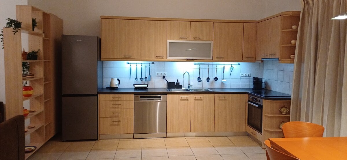 Mahusay na pagpipilian para sa isang nakakarelaks na bakasyon para sa isang pamilya na may mga bata o isang grupo ng mga kaibigan. Isang silid - tulugan na may 3 pang - isahang kama at sofa bed sa silid - kainan. Ang apartment ay may kusinang kumpleto sa kagamitan at malaking patyo na may mga nakakamanghang tanawin. Mayroon din itong maliit na pier kung bumibiyahe ka sakay ng bangka . Tahimik ngunit napakalapit din sa beach at sa central harbor market.