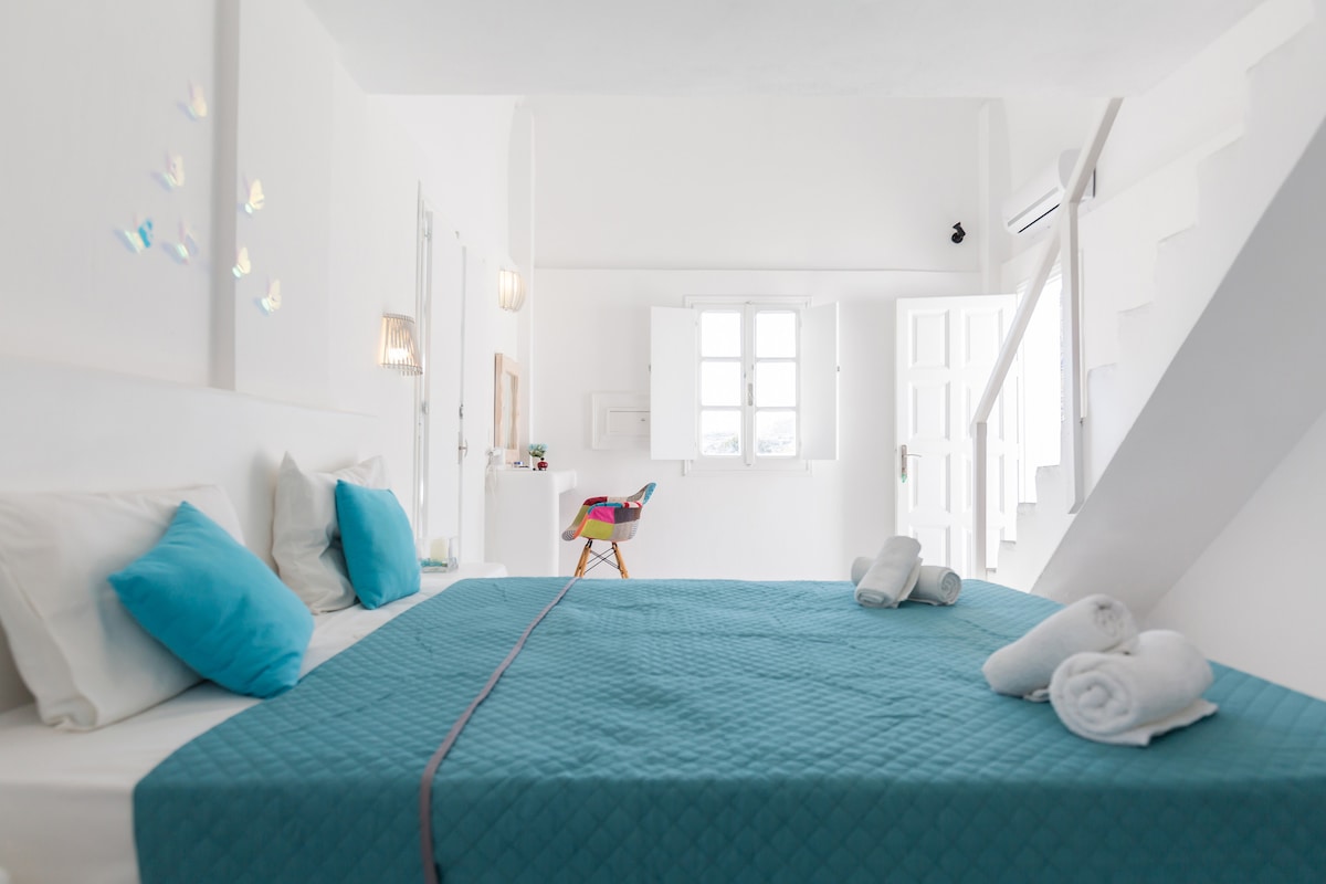 A brand-new elegant suite consists of a bedroom, a bathroom, a kitchen, and a cozy seating area. It offers a large terrace with a private hot tub and stunning views of the Aegean Sea. Ideal for couples and honeymooners offering unforgettable romantic moments. Located some meters away from the center of Emporio where you may find markets, a bus station, local places for coffee & food,and the historical Kasteli of Emporio.The famous Black beaches of Perivolos and Perissa are a 5-minute drive.