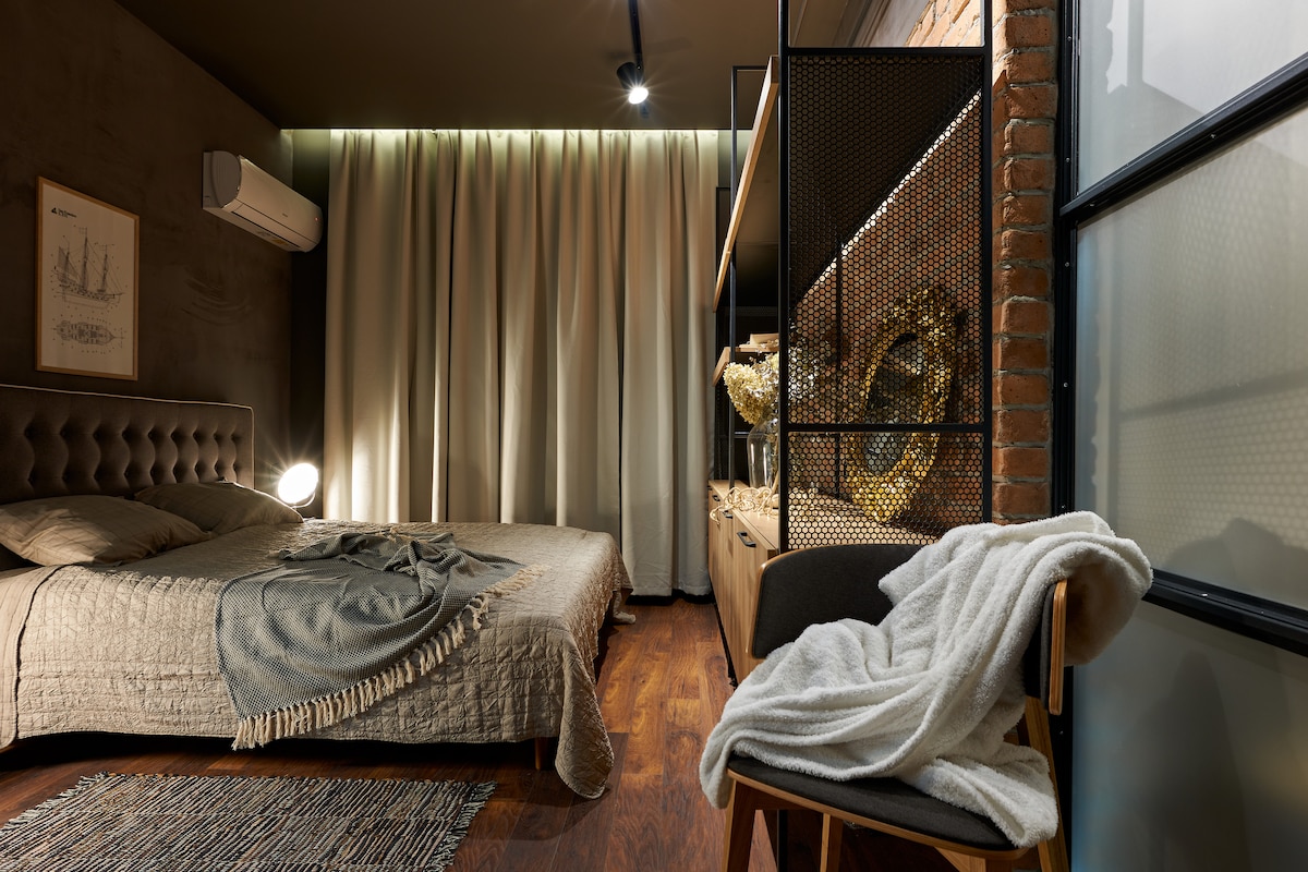 Двухуровневые апартаменты с видом на город — стильные и уютные. На первом этаже — гостиная с большим диваном и полностью оборудованной кухней, на втором — спальня с двуспальной кроватью и отдельной гардеробной. С балкона открывается вид на зелёный бульвар. Район Лазур: магазины и кафе рядом, а до моря или центра Бургаса — всего 20 минут пешком неспешным шагом. Подходит для пар, путешественников и тех, кто ценит чистый воздух, живописные беговые маршруты и birdwatching в сердце Вика Понтика.