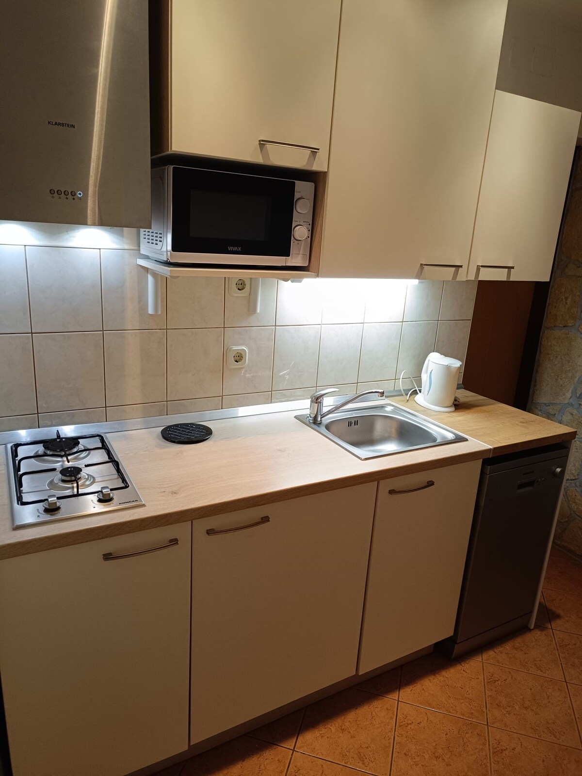 Second- floor apartment has a large living area (with a pull-out sofa) and a kitchen, two master bedrooms with a king-size bed, a bathroom with a shower and WC, a private whirlpool and grill. The apartment has modern kitchen appliances (dishwasher, induction cooker and a large refrigerator), an LCD TV, and inverter air conditioning. Free Wi-Fi is available throughout the Villa. We can prepare you tasty breakfast (not included in the price), which can be enjoyed on the terrace.