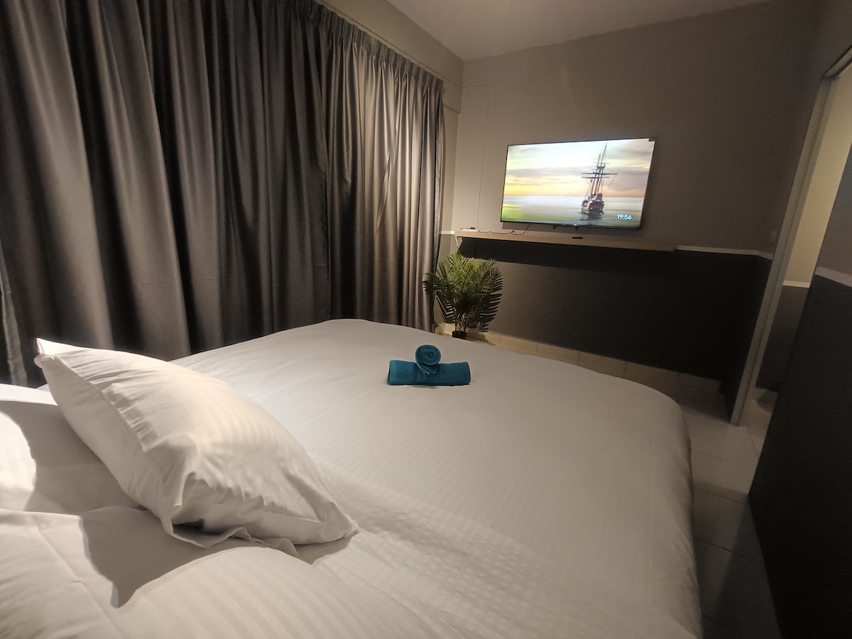 I - explore ang aming komportableng studio, na puwedeng tumanggap ng 2 hanggang 3 tao na may queen bed at sofa bed. 15 minutong biyahe lang ang layo mula sa KLIA T1/T2, napapalibutan ang lugar ng maraming restawran, sanga ng fast food, pamilihan, at labahan. Tangkilikin ang lahat ng amenidad, kabilang ang palaruan ng mga bata, BBQ area, gym, at swimming pool, nang may 24/7 na seguridad. * Hindi available ang iyong bagahe bago ang oras ng pag - check in. Dahil sa disenyo ng gusali, kailangang maglakad ng 10 baitang na hagdan para makakuha ng elevator.