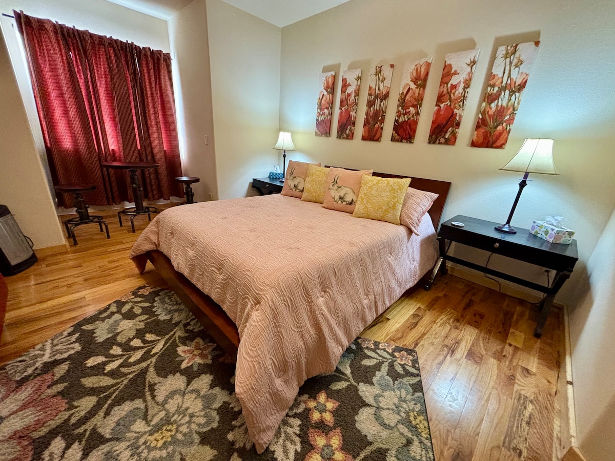 Huge suite: Explore, then relax! Pillowtop king size bed + 2 bonus futon sofa sleepers. Bathroom in suite has large jetted soaker bathtub (in open area), doored privacy toilet, private double shower heads and 2 vanity sinks. Walk in closet + dresser. In our popular, multi-guests Burro Flats High Desert Lodge (other travelers in same home). 5 min drive from city center Self-serve breakfast is very basic; you prepare it on your own schedule (bagels/toast, coffee/tea, fruit, oatmeal)