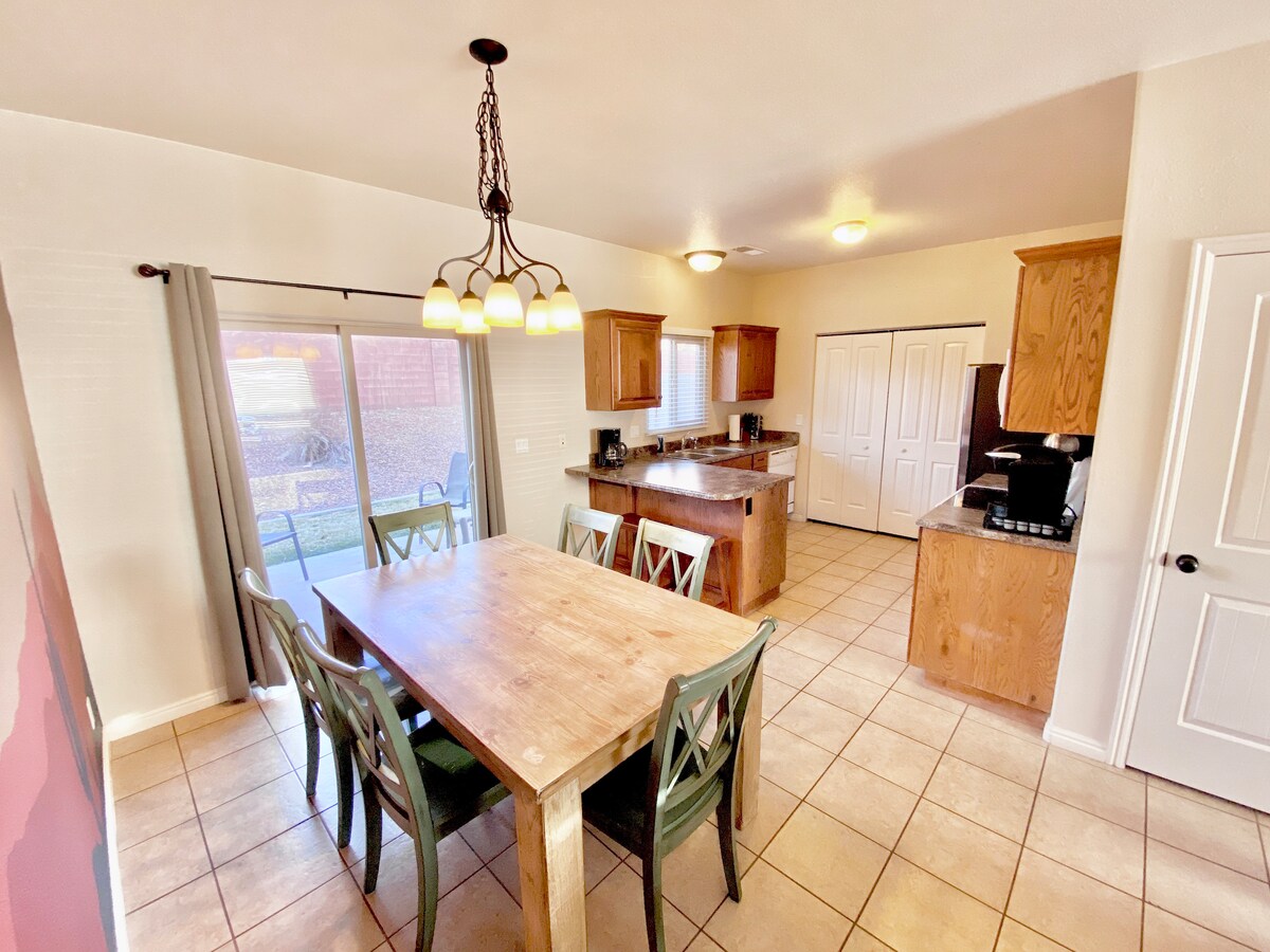 Mamangha sa tanawin ng pulang bato sa bawat kuwarto! Matatagpuan sa kapitbahayan ng La Estancia sa Kanab, may access sa clubhouse ang tuluyan na ito na may indoor pool at hot tub na bukas buong taon, silid-ehersisyo, at seasonal na outdoor pool (Mayo hanggang Setyembre). Ang lahat ng hiking, grocery, tindahan at downtown ay isang disenteng lakad mula sa pinto sa harap. Ang tuluyang ito ay pinangasiwaan nang isinasaalang - alang ang cook, panadero, mambabasa, adventurer, game player, at zen seeker. Ito ang magiging base mo para sa mga pakikipagsapalaran mo sa UT/AZ Park!
