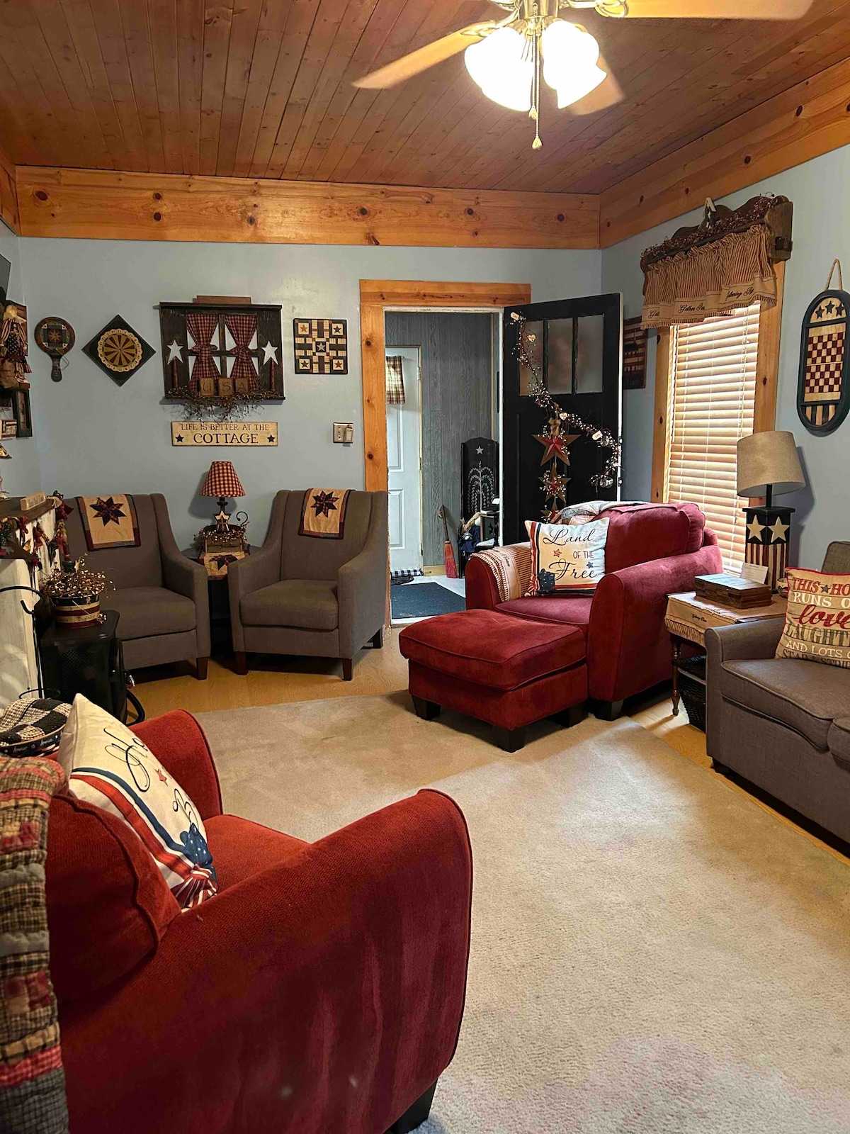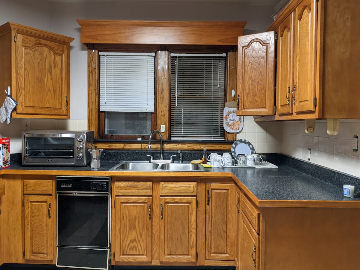 Malaking bukas na konsepto, pampamilya, natutulog hanggang sa Ang 10 sa 4 na silid - tulugan, dagdag na fold out, ay nag - aalok ng state - of - the - art na ilaw at mga amenidad na may smart tv sa lahat ng silid - tulugan at mga istasyon ng pagsingil. Kumpletong kusina, na may ref ng wine sa ilalim ng counter. Buong Labahan, Gas log fireplace na may awtomatikong thermostat. Paradahan ng 4 na kotse sa harap na may carport at posibleng 5 puwesto sa likod. Sa maliit na lungsod na malapit sa mga parke, gas, restawran, pamilihan, antigong pamimili, parmasya at interstate. Paglalakad at pagbibisikleta