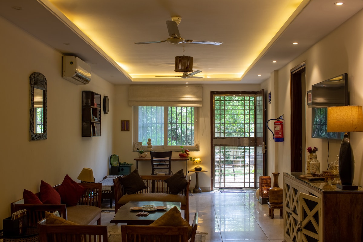 Welcome to Garden Oasis: a luxurious, sun-lit, 3500 sq ft, 4-bedroom, ground-floor, fully-serviced stay in South Delhi. Located a 5 mins walk from Malviya Nagar Metro, PVR Saket and Select CityWalk/ DLF Avenue malls. 4 luxe en-suite bedrooms with king-sized beds, attached baths, air purifiers, smart TVs, and premium hotel-style linen. Unwind in the spacious open-plan living + dining, cook Indian/ International meals in the fully equipped kitchen, and connect with nature in the private garden.