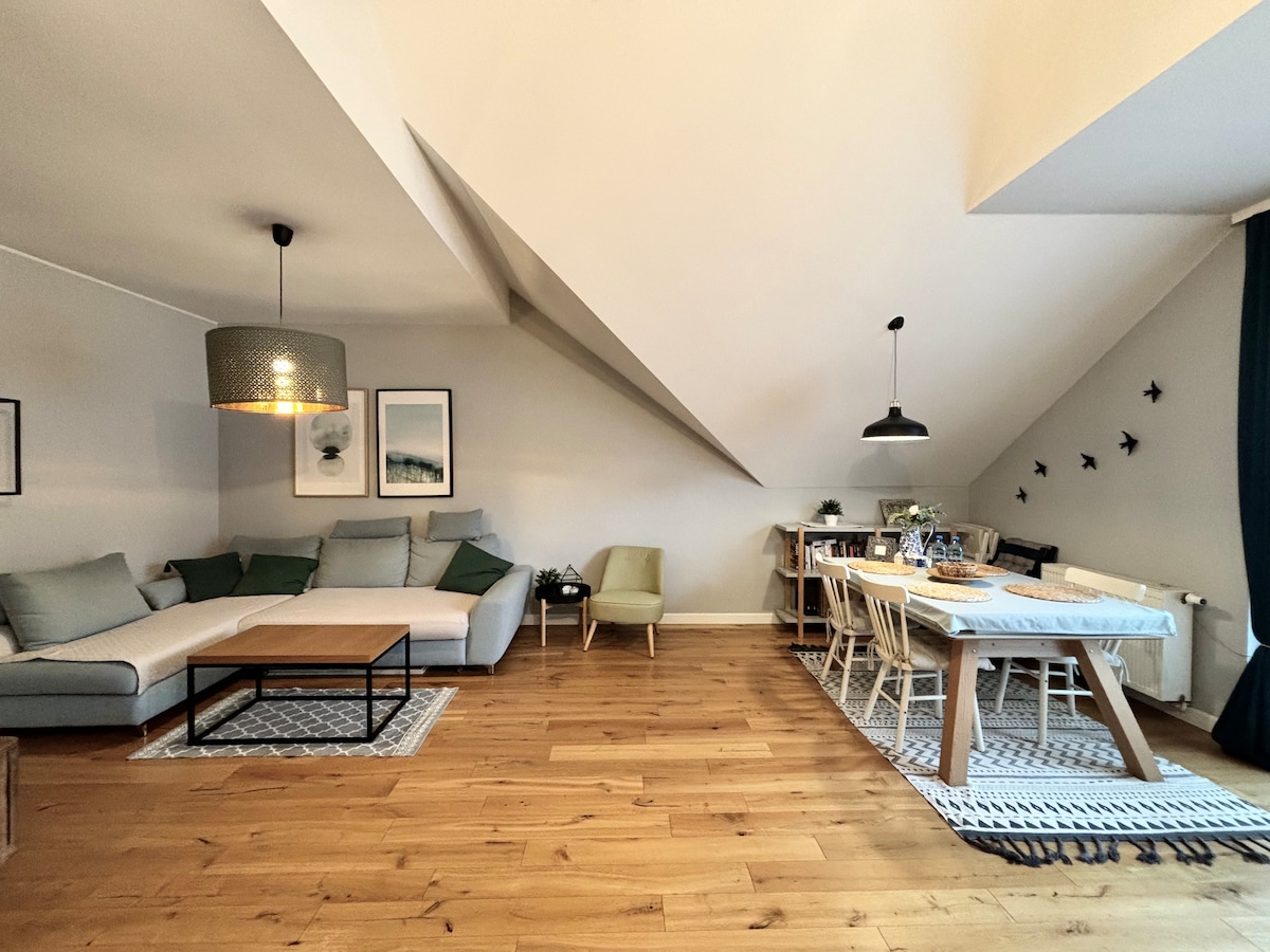 This sunny, high-standard and fully equipped 2-room, 55sqm apartment with balcony consists of a spacious living room with comfy sofa, TV and a dining table, air conditioning. A fully equipped kitchen. A bedroom with a double bed, big wardrobes and a desk with screen to work. Bathroom with a walk-in shower and washing machine. Balcony with a table and 2 chairs. Apartment is situated on the 3rd floor, it's quiet and very sunny. A dedicated parking slot included in price.