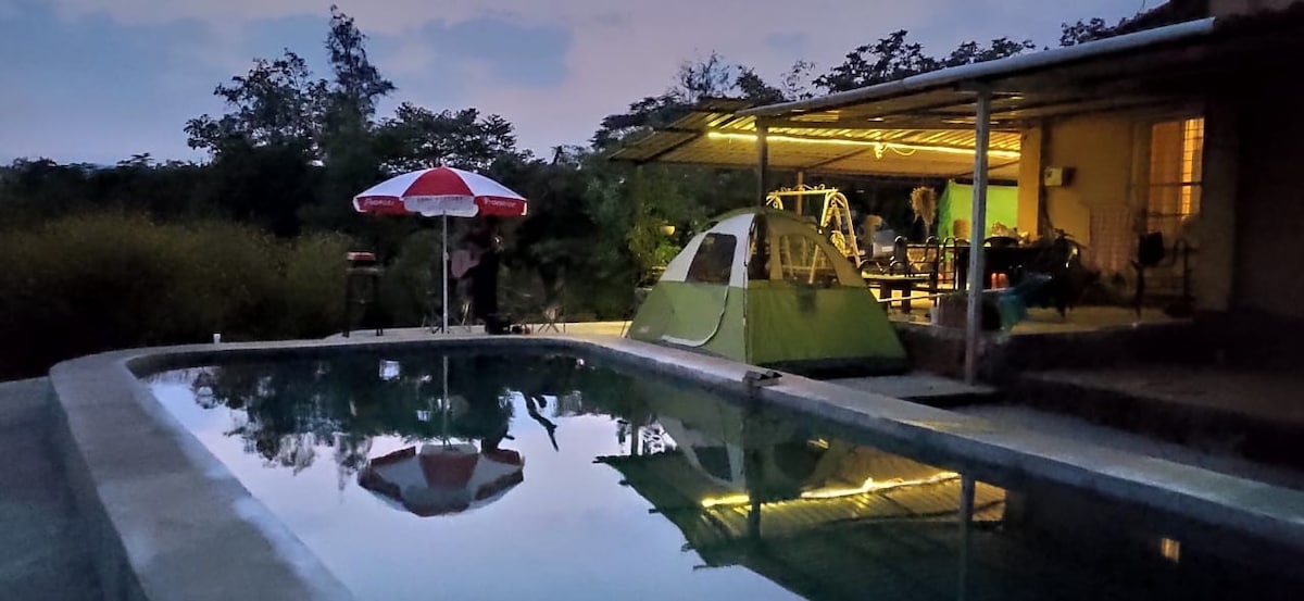 Welcome to Saanj 🌅, a serene farmhouse retreat nestled in the lush hills of Girivan, near Pune. Surrounded by greenery 🌿, cool breezes, and tranquil sounds of nature 🎶, Saanj is the perfect escape from the city’s hustle. Whether you’re here for a family vacation, a friends’ getaway , or a quiet work-from-nature retreat, our farmhouse offers the comfort of modern amenities blended with rustic charm. ✨