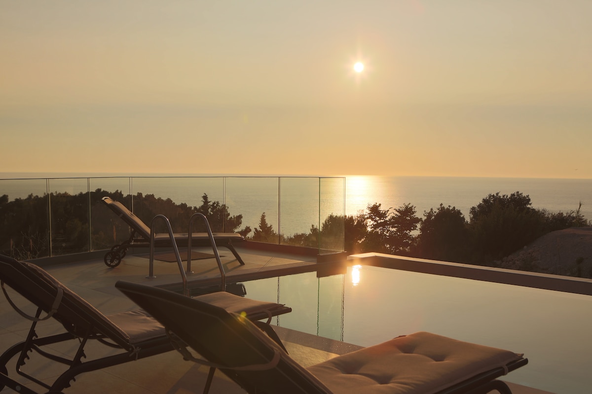 WAVE TWIN 1 INFINITY VILLA Bagong itinayo noong 2021 na may post sa kanlurang baybayin ng Lefkada na nag - aalok mula sa lahat ng panloob at panlabas na espasyo na walang limitasyong panoorin ang dagat at paglubog ng araw sa abot - tanaw. 5 minutong lakad papunta sa sikat na Kathisma beach na nag - aalok ng iba 't ibang restaurant, beach - bar, at iba pang aktibidad na ginagawa itong natatanging kumbinasyon ng vibrancy at personal na espasyo. Inuuna ng may pader na tatlong villa complex ang karangyaan at privacy.