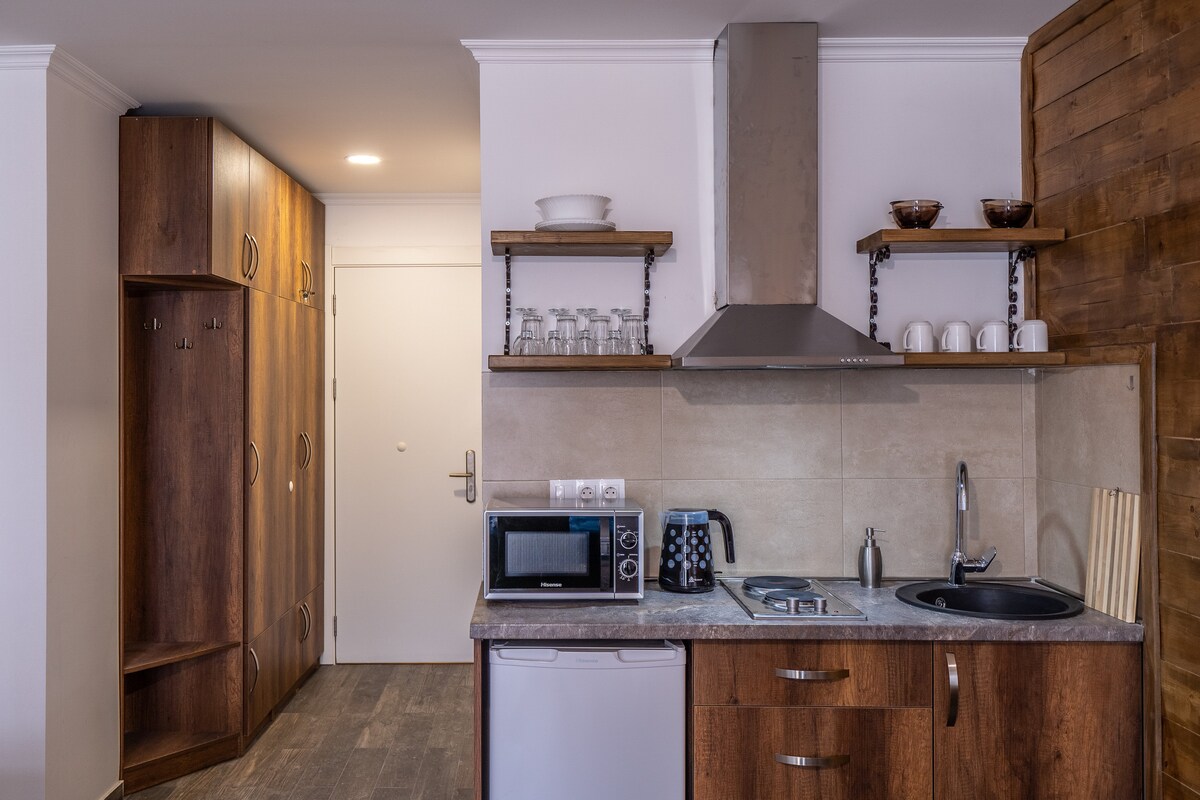 Maligayang pagdating sa studio sa Gudauri, Georgia, sa taas na 2200 metro! Ang sariwang pagkukumpuni na may kahoy at bato ay lumilikha ng komportableng kapaligiran sa bundok. Perpektong ilaw, mga functional na lugar - sala, silid - tulugan, kusina na may mga malalawak na bintana na nagbibigay ng natural na liwanag. Nag - aalok ang maaraw na bahagi ng mga nakamamanghang tanawin ng bundok. Malapit sa ski lift, mga tindahan at restawran - mainam para sa ski holiday. Pinagsasama ng studio na ito ang estilo, kaginhawaan at functionality para sa hindi malilimutang holiday.