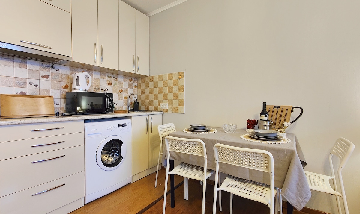 Magandang lokasyon, natutulog nang hanggang 4 na tao. Hiwalay na silid - tulugan na may queen - size bed (2 tao). sa sala: couch (1 tao) at pullout sofa (1 tao). Praktikal na kusina na may sapat na bar table. Microwave oven, cooktop na may 2 hob, malaking counter sa ilalim ng refrigerator. Malaking TV na may HDMI cable. Washing machine.