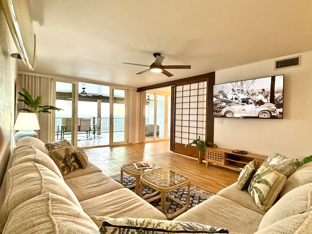 *Magandang tanawin mula sa oceanfront lanai *Makakita ng mga balyena, surfer, at pagong mula sa lanai *Beach/snorkel/surf sa labas mismo *4th Floor Penthouse na may A/C *Stocked kitchen incl air fryer *Saklaw na paradahan *Oceanfront Gas grill *Da Poke Shack sa complex *Pack 'N Play/High Chair *Shared Pool w/ hot tub *Ganap na na - remodel na w/ split air unit at dobleng vanity sa master