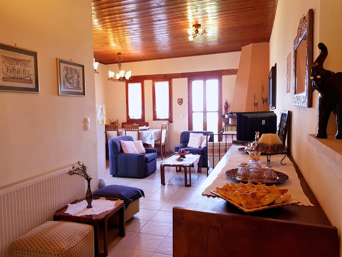 Isang maganda at tradisyonal na tuluyan na may magandang veranda at tanawin ng dagat at bundok. Tradisyonal ang gusali na may mga materyales mula sa rehiyon,na kaayon ng kapaligiran. Ang bahay ay matatagpuan sa kaakit - akit na nayon ng Kefalas at kayang tumanggap ng hanggang sa 3 bisita. Mayroon itong silid - tulugan, kusinang kumpleto sa kagamitan, sala na may fireplace at banyo. Ang distansya sa beach ay mga 10 min,habang sa nayon ay may mga cafe at restaurant, maliliit na tindahan at tindahan.