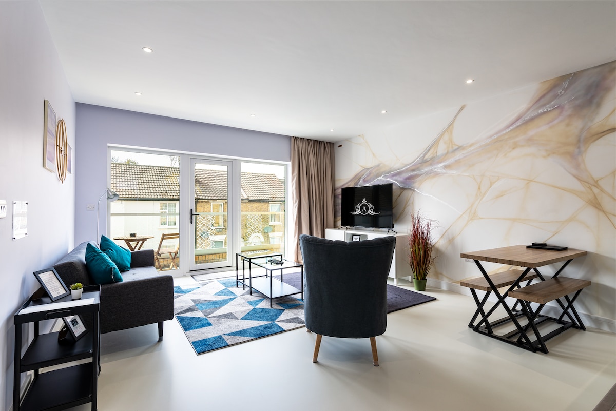 Mag - enjoy sa marangyang karanasan sa isang mapayapang sentrong serviced apartment. Na 2 minutong lakad lamang mula sa istasyon ng tren ng dartford at lokal na sentro ng bayan, na may mga tindahan ng pagkain at mataas na kalye na nasa maigsing distansya para sa iyong kaginhawaan. Mayroon din kaming paradahan para sa iyong kotse. Maaari mo ring tangkilikin ang libreng WiFi na may smart Tvs sa sala at silid - tulugan. Pati na rin ang isang en - suite sa labas ng master bedroom at isang pangunahing banyo na nagpaparamdam sa iyo sa bahay.