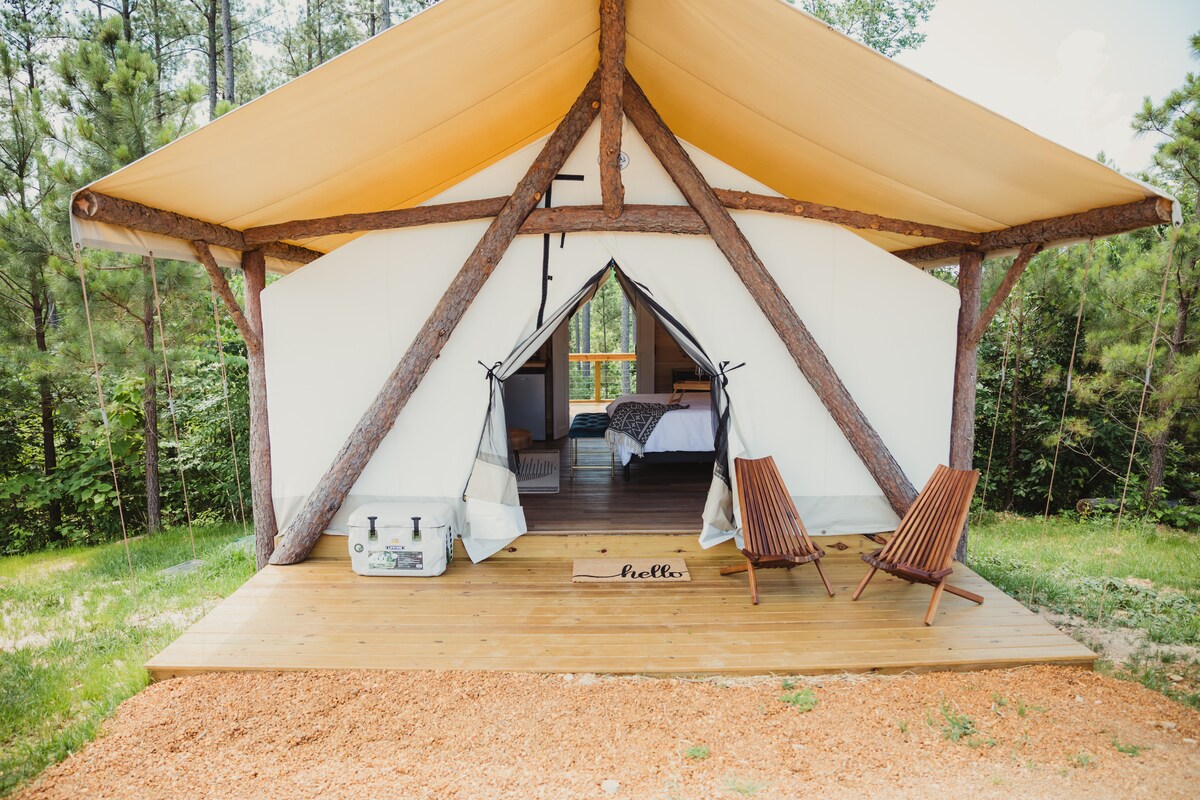 Ang PULA! Rustic luxury para sa dalawa ang nakatago mula sa iba pang mga tent. Malawak pero kaakit - akit, maraming maiaalok ang The Red. Isang kaaya - ayang beranda sa harap, pribadong fire pit, charcoal grill sa estilo ng parke, refrigerator, microwave, at coffee maker. Manatiling mainit at komportable sa hindi totoong fireplace at de - kuryenteng kumot. Nagbibigay ang nakatalagang banyo #2 ng privacy, hot shower, at mga sariwang tuwalya. Sabon at shampoo din! May maikling lakad ang bathhouse mula sa tent at may sariling pribadong banyo ang bawat tent.