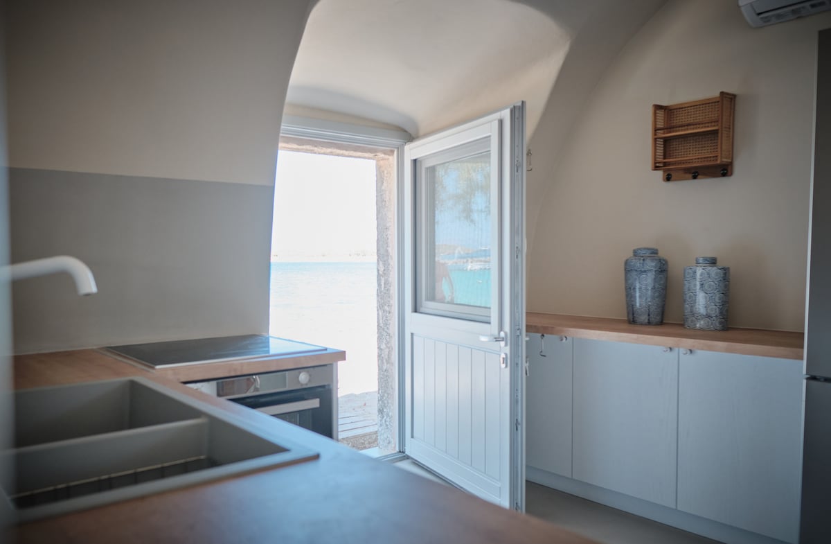 Located in Chora, the main vilage of the island, this apartment is a few meters away from the most scenic restaurants and bars of the island, yet, at the same time secluded from the noise of the night life. The bedroom is set in a traditional cave style (no window), while kitchen and living room have plenty of natural light and (two large windows and a glass door) are overlooking the sea and an inhabited hill.