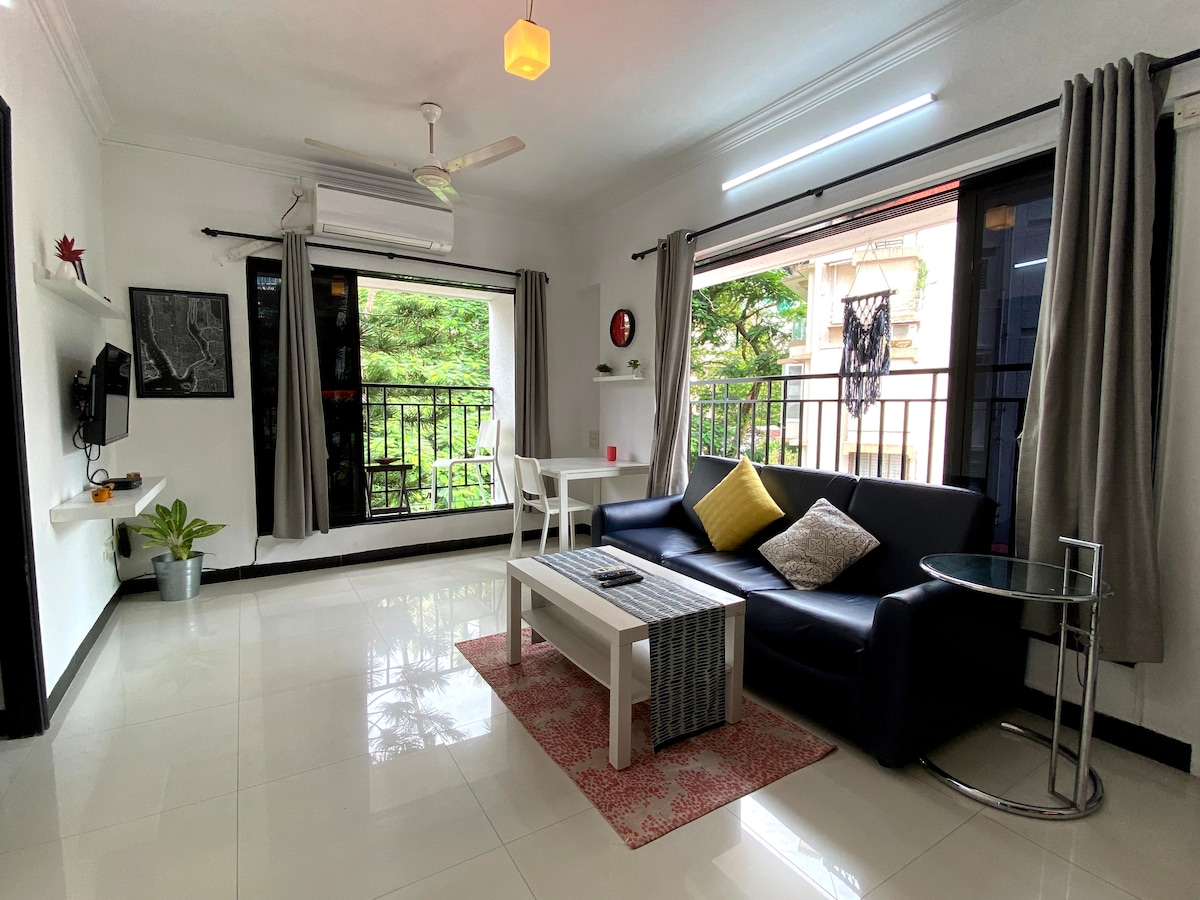 Isang medyo self - contained na 1 Bhk apartment, na may maigsing distansya papunta sa tabing - dagat ng Carter Road. Matatagpuan sa paikot - ikot na kalye, malapit sa Yoga house at maraming kaakit - akit na kainan. - 550 sqft 1st floor apartment na may access sa elevator - perpekto para sa trabaho/paglilibang - In - unit na washing machine - 42" Smart TV - Hi - speed na Wi - Fi - 24/7 na seguridad + CCTV - Nakatalagang paradahan - Available ang pagsakay sa airport kapag hiniling