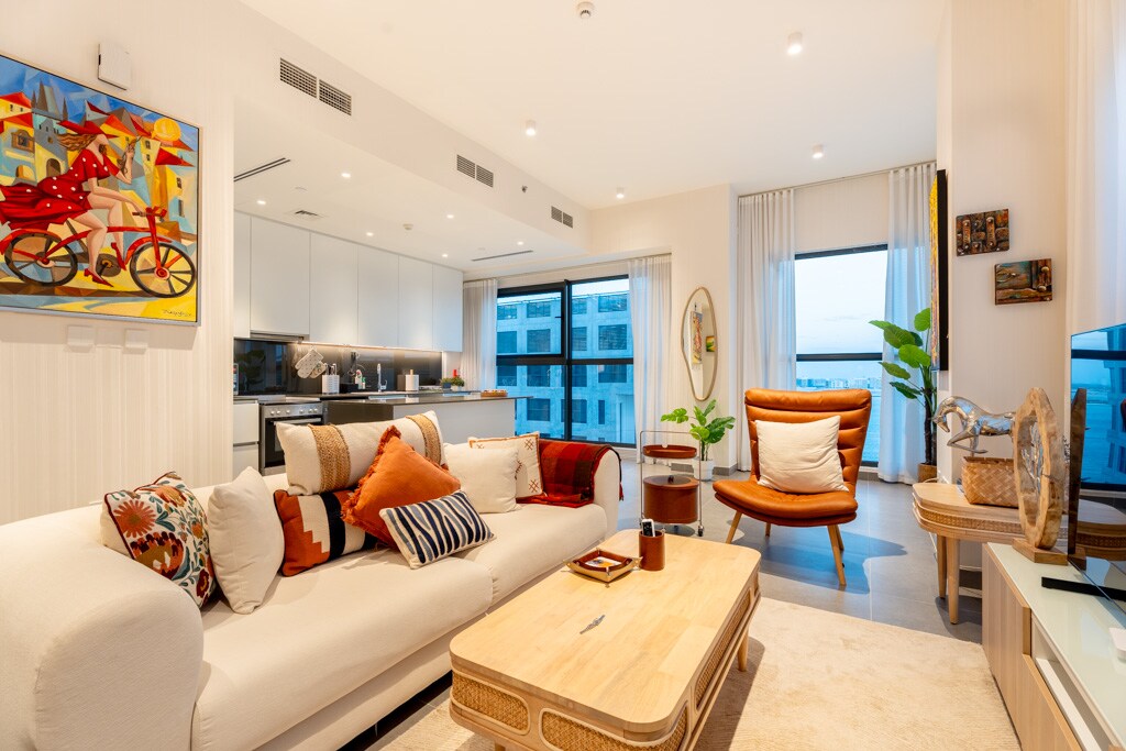 Sumali sa isang bohemian - inspired retreat sa Yas Island, isa sa mga nangungunang destinasyon sa tabing - dagat sa Abu Dhabi. Napapalibutan ng enerhiya ng Yas Marina Circuit, katahimikan ng daungan, at world - class na kainan, nag - aalok ang 1 - bedroom apartment na ito ng perpektong balanse ng kaguluhan at kalmado. Sa pamamagitan ng mga makalupang texture, mga detalye ng Arabesque, at mga tela na hinabi ng kamay, puno ng karakter at kagandahan ang tuluyan. Nagtatampok ng 120 pulgadang screen at surround sound, mainam ito para sa naka - istilong di - malilimutang pamamalagi sa Yas Island.