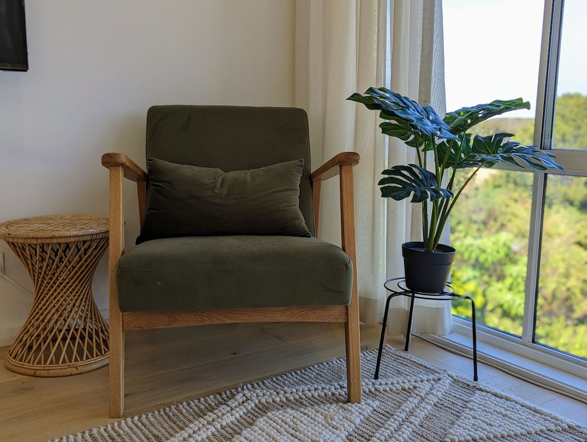 Magandang lokasyon, nakakamanghang tanawin at simoy ng dagat. Matatagpuan sa unang palapag ang maluwag at naka-air condition na studio na may sariling malawak na balkonahe. May ensuite at walk-in na robe. TV/Netflix at wifi. Privacy at kapayapaan. NB. Walang pasilidad sa pagluluto ~ oras para sa pahinga! Maglakad papunta sa mga pabulosong restawran at cafe. May refrigerator, takure, kubyertos, mga tea bag, atbp. para sa kaginhawaan. May double garage. May lugar para sa mga bisikleta o iba pang gamit. Malapit sa pantalan, Inlet, golf, sinehan, at marami pa. Hanggang 2 bisita