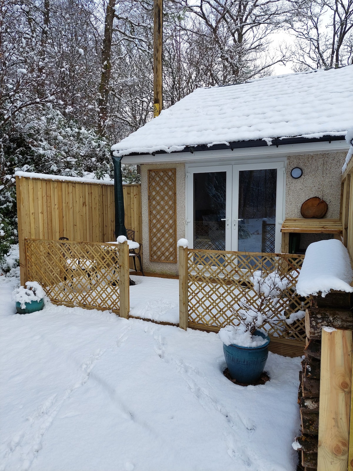Mapayapa at tahimik, mainam para sa alagang hayop na log cabin na may decking at patyo. Ang Cabin ay may nakapaloob na ligtas na hardin sa dulo ng isang pribadong shared driveway. Napapalibutan ng kagubatan at wildlife, na may maliit na batis na malapit dito. Kumpleto ang kagamitan sa cabin at may bukas na planong sala na may kusinang kumpleto ang kagamitan. Breakfast bar, Lounge na may 50" Smart TV & Xbox. 1 double bedroom, shower room at pribadong decking at seating area na may BBQ at fire pit. *Mga may sapat na gulang lang. Walang sanggol o bata mangyaring.