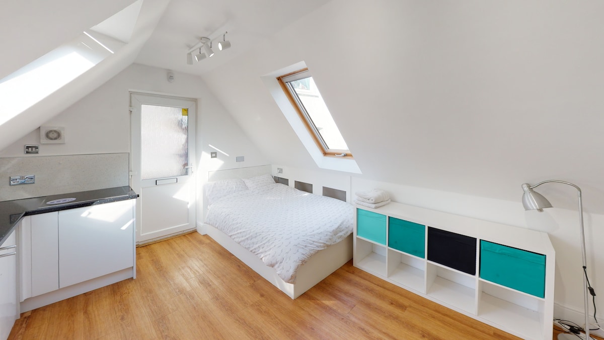 Magandang lokasyon ang hiwalay na studio na ito na nasa itaas ng garahe at nasa hardin sa tabi ng Bulwell Train and Tram Station (12–18 minuto ang layo sa lungsod). May paradahan sa kalye at 100 metro ang layo ng Tesco, mga tindahan, at Bulwell Market. Kamakailan lang ito ay na-renovate sa isang modernong estilo at may double bed, ensuite shower, hob, refrigerator, kusinang kumpleto sa kagamitan na may microwave oven, kettle, toaster at mga kagamitan sa pagluluto, bar table, 43" smart TV, hiwalay na washer at dryer at 140 meg business wifi. Mainam para sa maikli o mas mahabang pamamalagi.