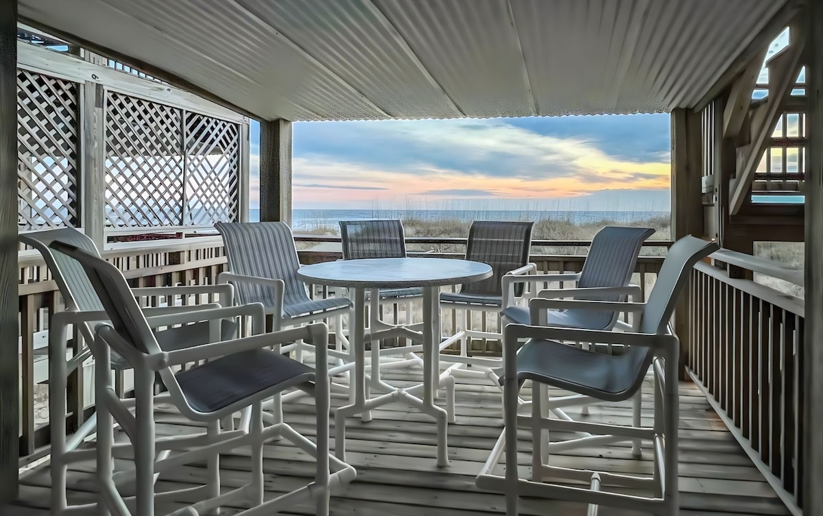 Ganap nang naayos ang yunit ng pagtatapos sa tabing - dagat (unit A1) na ito at nagtatampok ito ng matataas na bintana na may mga walang harang na tanawin ng pagsikat ng araw sa karagatang Atlantiko. Nagtatampok ang ikatlong palapag ng bagong kusina, kainan para sa anim, smart tv at upuan sa lounge. May dalawang silid - tulugan sa ikalawang palapag, na may buong banyo ang bawat isa. Mahahanap mo ang lahat ng iyong kagamitan sa beach sa garahe sa ibabang palapag. Mga pribadong amenidad sa komunidad: pribadong beach access, pool, hot tub, tennis/basketball/shuffleboard court, game room para sa mga bata, at marami pang iba.