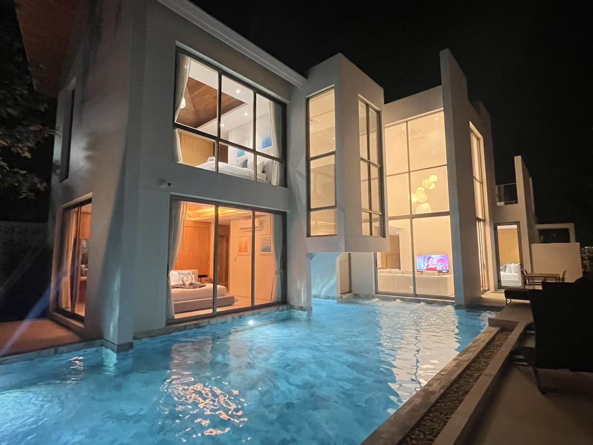 这套普吉岛全新Y2别墅,占地500平米,园林景独栋超大泳池4卧5卫别墅,相信你看了一眼就会爱上它,进入别墅,别墅内的装修设计简约现代,全新装修,非常干净清爽舒适 每个房间都有独立卫生间和浴室,提供舒适和隐私空间,宽敞的厨房设备齐全,满足你的烹饪和聚餐需求。而在别墅外部,超大泳池美轮美奂,不失优雅风情,让人仿佛置身于异国风情之中,心境倍感舒畅。 踏入院落,明媚清雅的气息扑面而来,有泥土的芬芳,有草木的茂盛,有沙滩椅的悠哉休闲,一切都是自然优雅,淡淡的美,为这套别墅增加了不少诗情画意。而当夜幕降临,在泳池的灯光点缀下,整个别墅夜景显得格外迷人,在户外桌椅上用餐,在音乐声的此起彼伏中,和朋友喝上一杯美酒,美哉、乐哉! 在这里,你可以尽情享受到宁静、私密的的度假时光,摆脱城市的喧嚣和烦恼,尽情享受大自然的美妙与恩赐,这就是入住普吉岛Y2别墅带给你的无尽幸福!尽情放松。