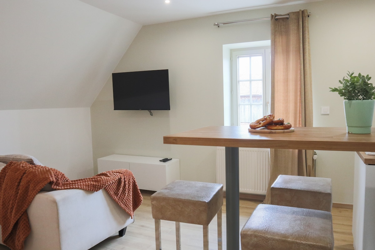 Bienvenue dans notre appartement, situé à l'étage d'une maison individuelle. Les espaces de vie sont lumineux et spacieux. La cuisine entièrement équipée vous permettra de préparer vos repas préférés avec facilité. Les deux chambres confortables invitent à une bonne nuit de sommeil. Situé a 15 min de la Suisse et de Mulhouse, vous pourrez découvrir la richesse culturelle de la région en visitant les charmantes villes historiques à proximité. Draps et serviettes de bain sont inclus.