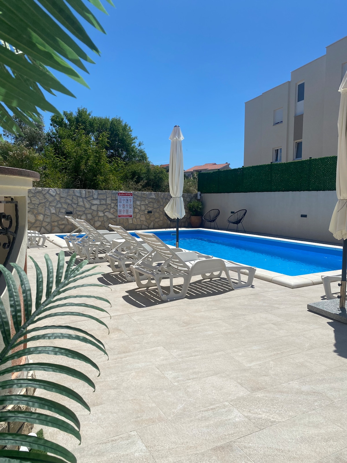 Matatagpuan ang apartment sa unang palapag at may 2 silid - tulugan na may mga balkonahe, malaking sala na may kusina, 3 banyo, at balkonahe na may malaking mesa at ihawan. Matatagpuan sa Novalja, 2 minuto mula sa beach, nag - aalok ito ng libreng Wi - Fi, air conditioning, seasonal outdoor pool, at hardin. Ang apartment ay may sala na may flat - screen TV, kumpletong kusina at dishwasher. May TV at foosball sa terrace ang bawat kuwarto. Available ang mga sun lounger at SUP board.