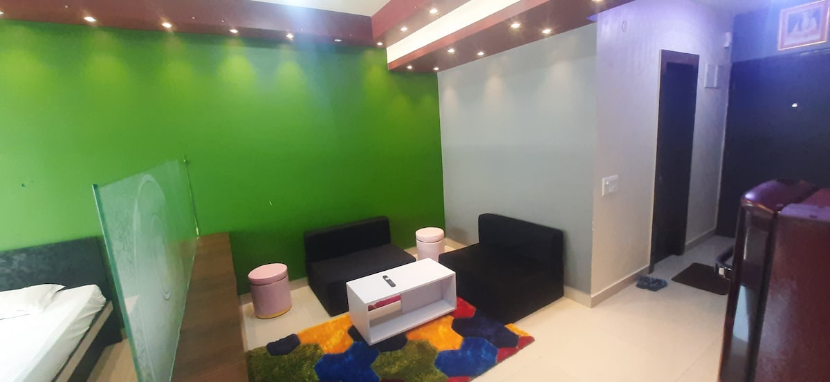 Masiyahan sa Elegant Fully Furnished Studio apartment na may Home Automation (Voice Controlled) sa gitna ng South Kolkata; 200 metro lang ang layo mula sa Tollygunge Metro Station. Mula sa bahay, puwedeng lakarin ang lahat (Metro Station, Market, Bus Stop, Ospital, Restawran, Parmasya, Malls, Bank & ATM), atbp. Nilagyan ang Bahay ng Smart Lock, kaya hindi kailangang mag - alala tungkol sa pagkawala ng susi. 65’ Projector 1.5T Split AC Hob na may Chimney Microwave Refrigerator Tustahan ng tinapay Hair Dryer Coffee Maker Mixer