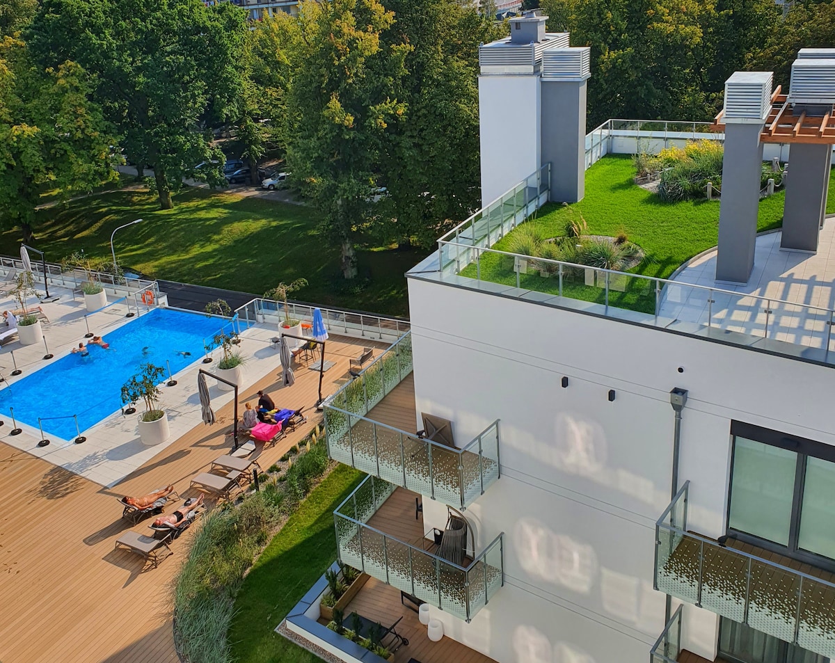 May naka - istilong apartment na may dalawang silid - tulugan na matatagpuan sa lugar ng Polanka Aqua, sa kanlurang bahagi ng Kolobrzeg, sa paligid ng Natura 2000 Park at mga beach ng Kolobrzeg. Sa distansya mula sa sentro ng lungsod, makakapagpahinga ang aming mga bisita nang payapa at tahimik, na napapalibutan ng kalikasan. Ang property ay may swimming pool na may sauna - na magagamit mo, nang libre (bukas mula sa: pool 9 -21, sauna 16 -21), fitness area at playroom ng mga bata.