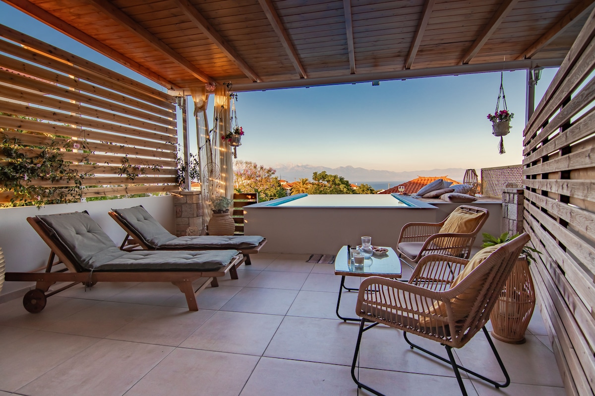 Masiyahan sa iyong pamamalagi sa marangyang tuluyan na 800 metro lang ang layo mula sa beach at 3 km lang mula sa Koroni. Ang bahay ay may kumpletong kusina, mga vintage na de - kuryenteng kasangkapan,sofa sa sala,smart tv, wireless internet at wifi. Ang dalawang komportableng silid - tulugan ay may mga dobleng higaan na may mga kutson na may mahusay na kalidad at mga modernong aparador. May tanawin ng dagat ang balkonahe,habang sa likod ng patyo ay may Jacuzzi para sa 4 na tao(Mio - Oktubre) na shower,malaking silid - kainan at paradahan.