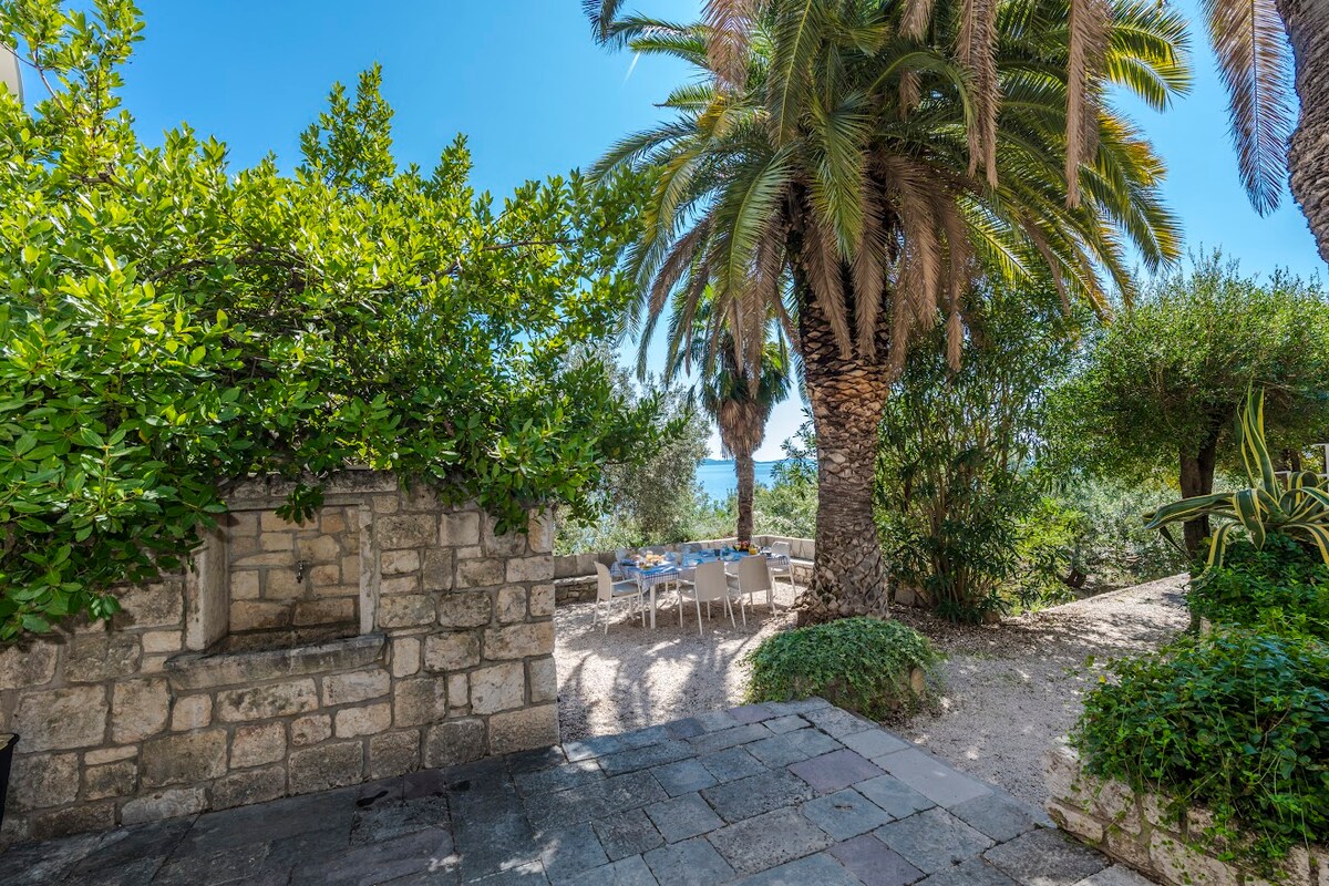 Itinayo ang aming bahay sa klasikong estilo sa timog na may mga facade na gawa sa puting bato mula sa isla ng Brac at malawak na kapaligiran . Stone house na may magandang interior trim, na binubuo ng 4 na silid - tulugan na may 4 na pribadong banyo, sala (satellite TV), terrace. May 8 upuan ang bahay sa beach, barbecue, at berth para sa mga bangka. Ginagarantiyahan ka namin ng kaaya - ayang holiday.