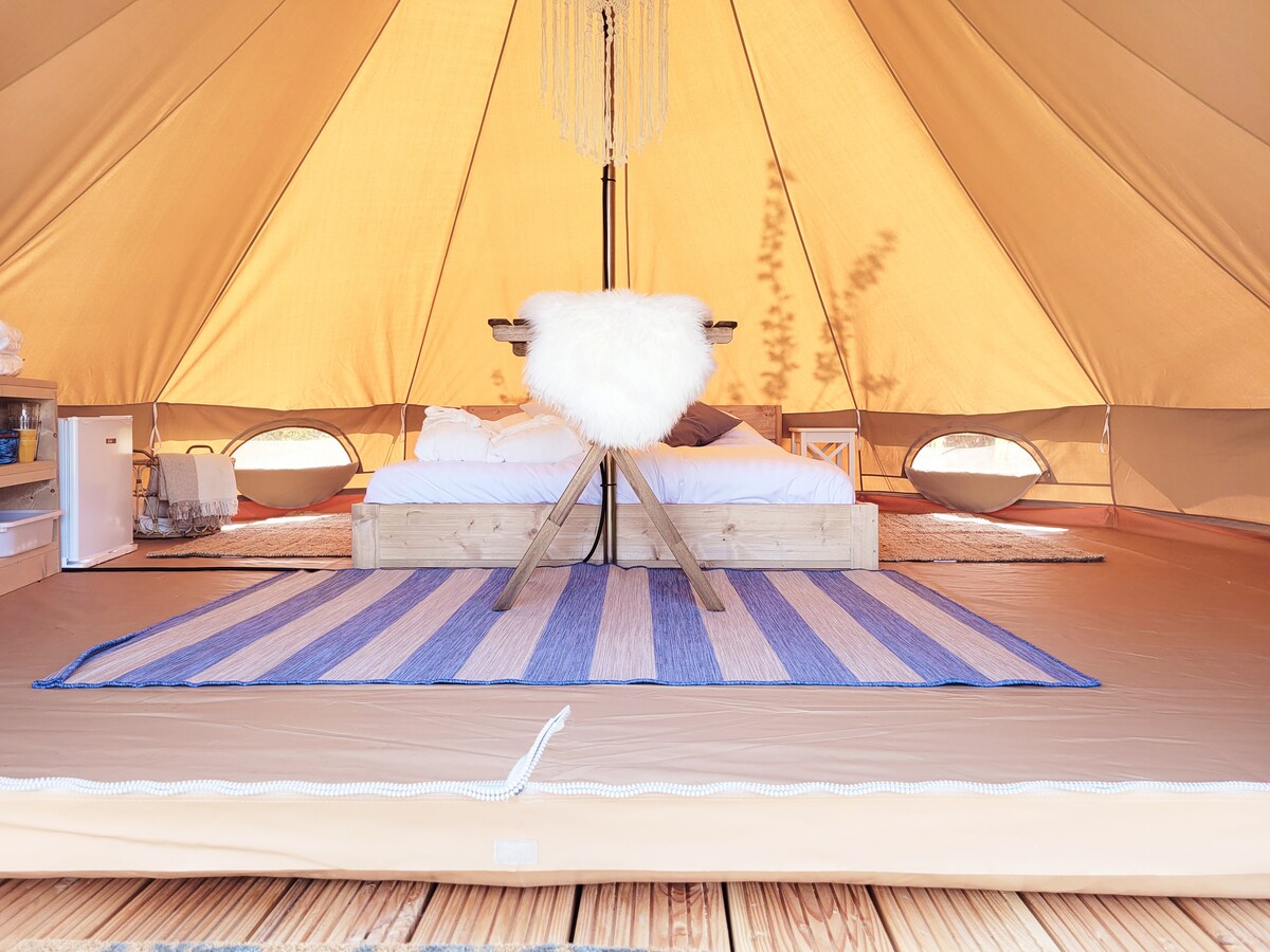 Wij (jong gezin met 4 kids) verhuren op ons terrein een prachtig ingerichte Bell tent voor een uniek verblijf dichtbij het strand ! Geniet van het weidse uitzicht bij een knisperend kampvuur! Maak gebruik van de luxe afgewerkte badkamer ! Ook staat er een finse kota met een kleine keuken. Heerlijk wakker worden door het gemekker van Nora ons schaap of kwik,kwek en kwak onze loopeenden! Wilt u vanuit de hottub kijken naar de sterren dan kunt u deze huren voor €50,- per nacht!