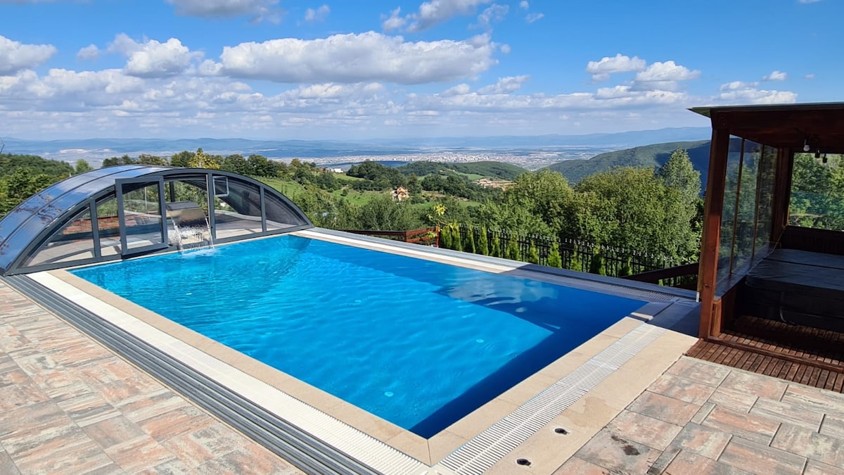 Escape to Villa Ozoni, a stylish and inviting retreat nestled in the picturesque village of Jezerc-Ferizaj, perched at an impressive elevation of 1100m above sea level. This stunning villa boasts four spacious bedrooms, two modern bathrooms, and a cozy living room that lets you unwind and relax. Step out onto the terrace and be captivated by the awe-inspiring view of the surrounding landscape, while the refreshing pool and inviting jacuzzi provide the perfect oasis for rejuvenation.