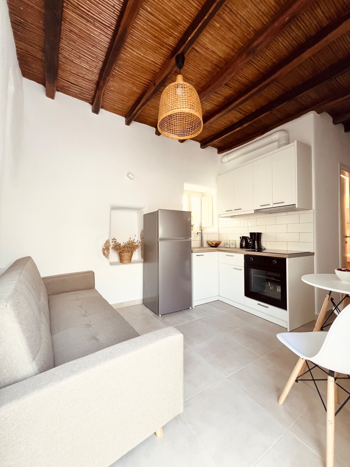 Sueno sunset villa for 2 is located in a nice area which combines beautiful sea-views,it is part of a complex consisting of 5 other apartments,It is 2,3 kilometers from the port of Parikia .The old town, the shops and the night life are 1200 meters away. It is 33 square meters and has a fully equipped kitchen, 1 bedroom, a living room, 1bathroom and veranda with jacuzzi is not heated. You deliver it clean with sheets and towels and there is not a service include during your stay.