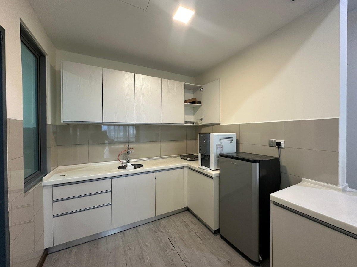 Matatagpuan ang aming tuluyan sa Loft B level 8, na nakaharap sa tanawin ng hardin at nagtatampok ng balkonahe. Ang aming tuluyan ay binubuo din ng 2 silid - tulugan, isang flat - screen TV na may mga TV Box channel, WIFI provided, kusinang may induction cooker, refrigerator, at washing machine. 我们的民宿位于B楼第8层享有城市的美景,设有阳台,住宿还包括2间卧室,平面电视无线网络,带电磁炉的设备齐全的厨房,冰箱和洗衣机,