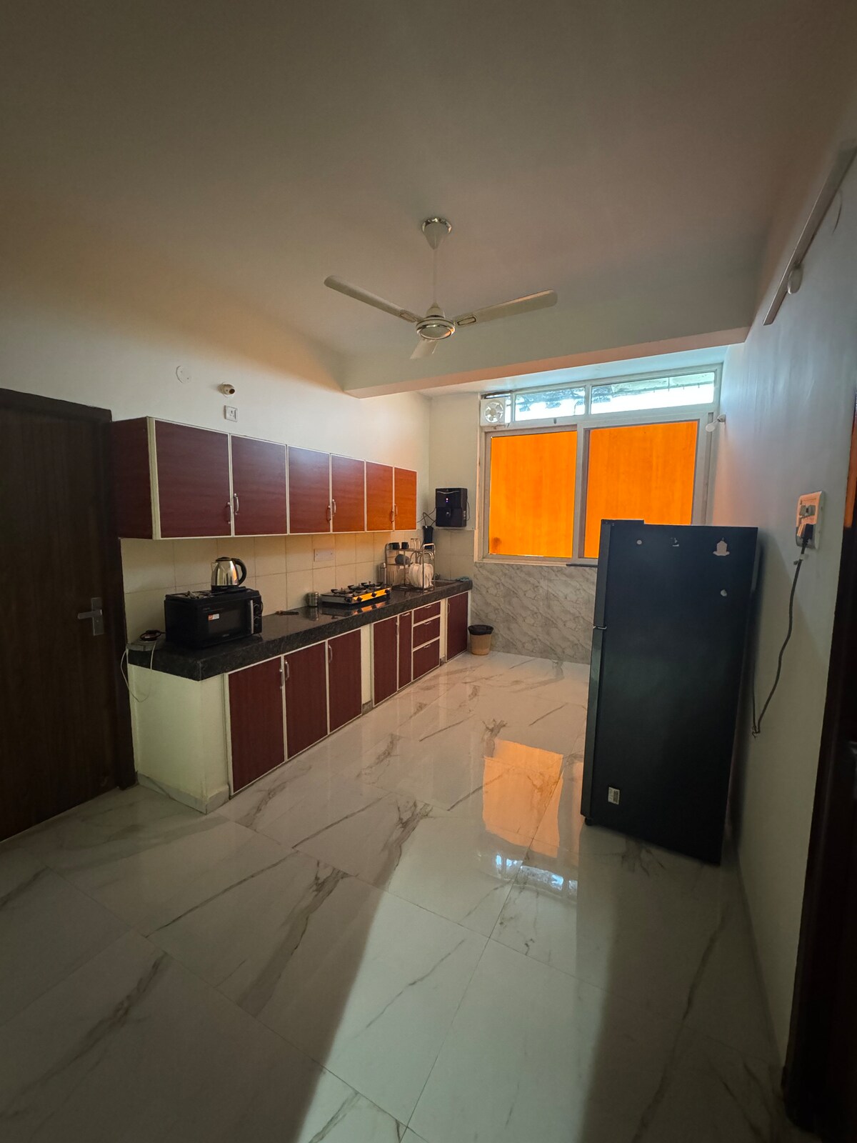 Stylish, fully furnished apartment designed for comfortable Airbnb stays. It features a modern modular kitchen with a refrigerator, a cozy bedroom with a double bed and wardrobe, clean tiled flooring, and warm ambient lighting throughout. The space is secure, well-maintained, and thoughtfully designed - ideal for families and working professionals seeking short or long stays. Note: This property is strictly for pure vegetarians, and unmarried couples are not allowed.