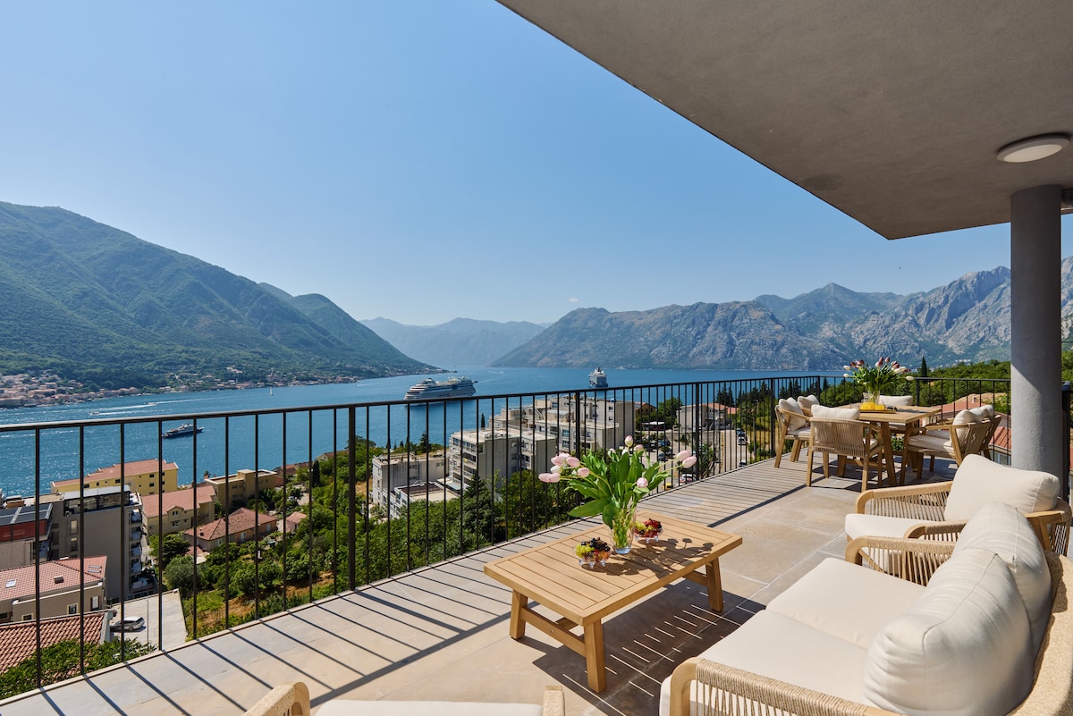 Modernly designed penthouse na may nakamamanghang tanawin sa Bay of Kotor at Verige strait. Ang lugar kung saan mararanasan mo ang pinaka - romantikong sunset sa iyong buhay! Maluwang, maliwanag, elegante! Sa lahat ng amenidad para sa * * * * hotel, ang aking tuluyan ang perpektong lugar para sa iyong pangarap na bakasyon kasama ang pamilya at mga kaibigan! Nasa perpektong lokasyon, sa pagitan ng Kotor at Perast, na may Bajova Kula beach sa harap ng ari - arian - perpekto para sa pagrerelaks at masiglang bakasyon.
