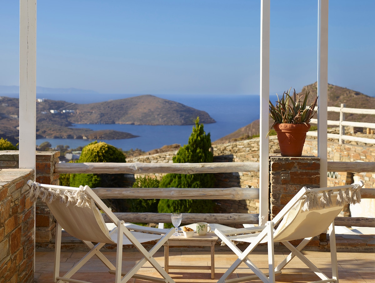 Stone suite 10 metro lamang mula sa beach. Napakalaking bintana para sa pagtingin sa tanawin ng dagat, may panlabas na pergola na may upuan at mesa. Kusinang kumpleto sa kagamitan at komportableng banyo/shower. Habang inaakyat ang mga hagdan na kahoy, darating ka sa kuwarto kung saan mas maganda ang tanawin ng dagat. Ang malakas na presensya ng kahoy na pinagsama sa built-in na kama at sofa ay nagpapahiwatig ng mga mararangyang bahay ng Cyclades.